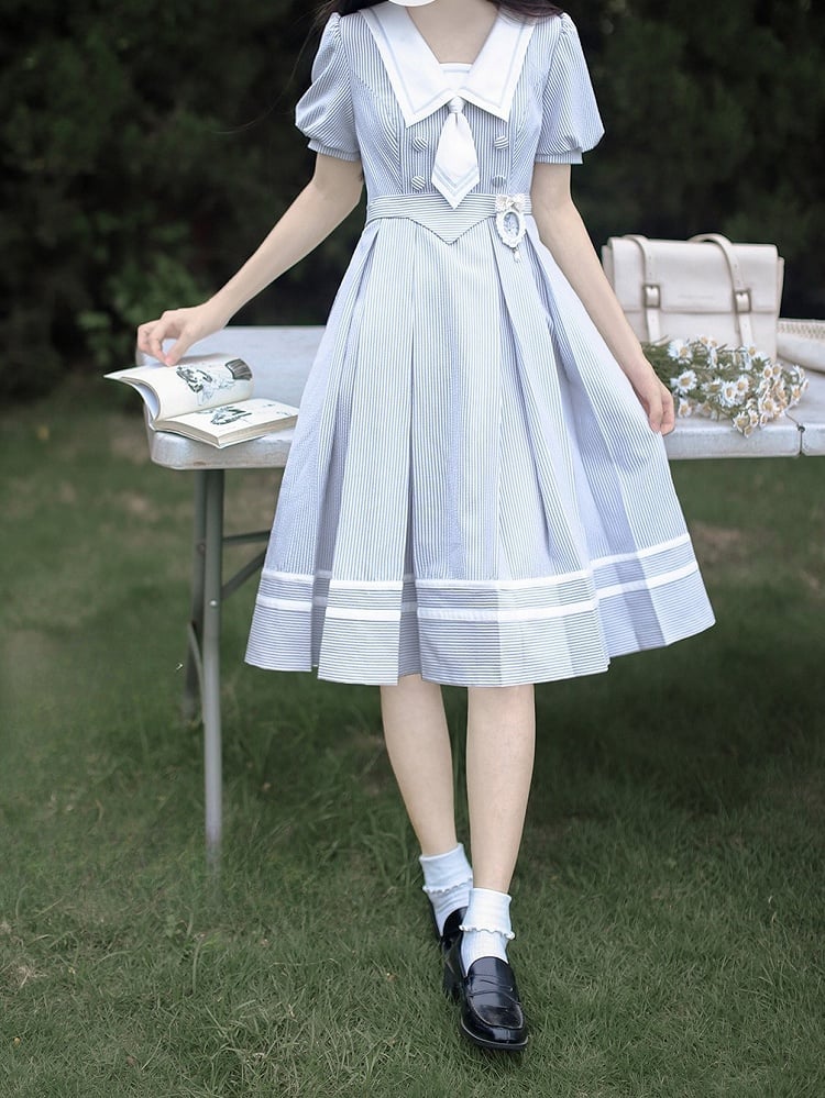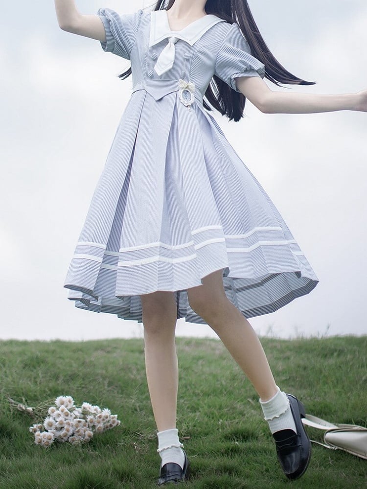 青と白のオールドスクールロリータファッションドレス 蝶結びディテール JSK セット