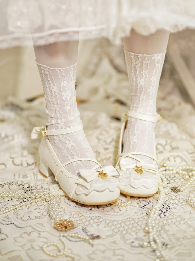 ミルキーホワイトのハートチャームリボンとトップレーストリムのクロスデザインロリータシューズ