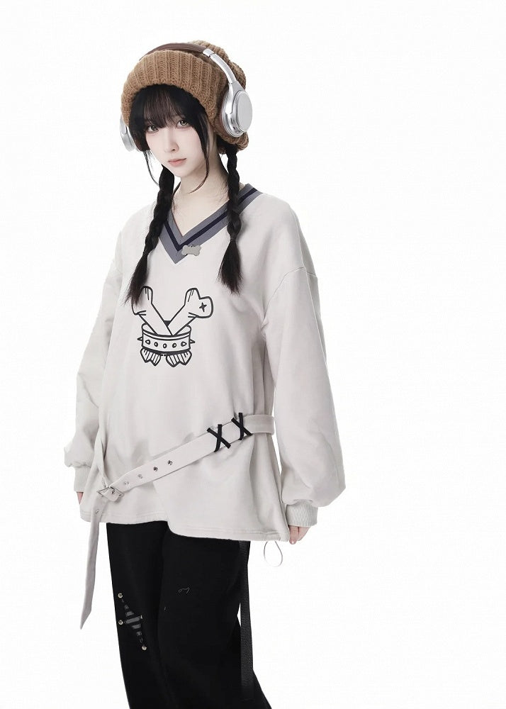 ホワイトVネックキュートボーンスウェットシャツ