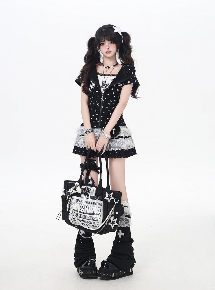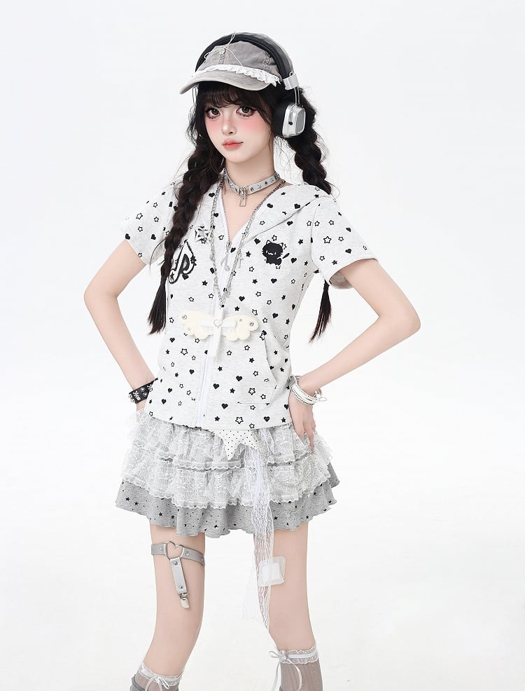 Y2K キティイヤーフード オールオーバー スター&ハートプリント オフホワイト/ブラック ジップアップジャケット