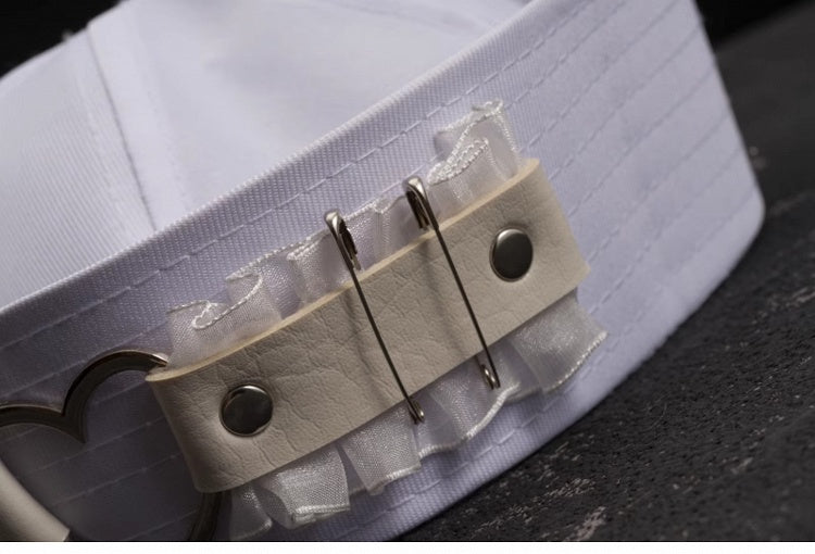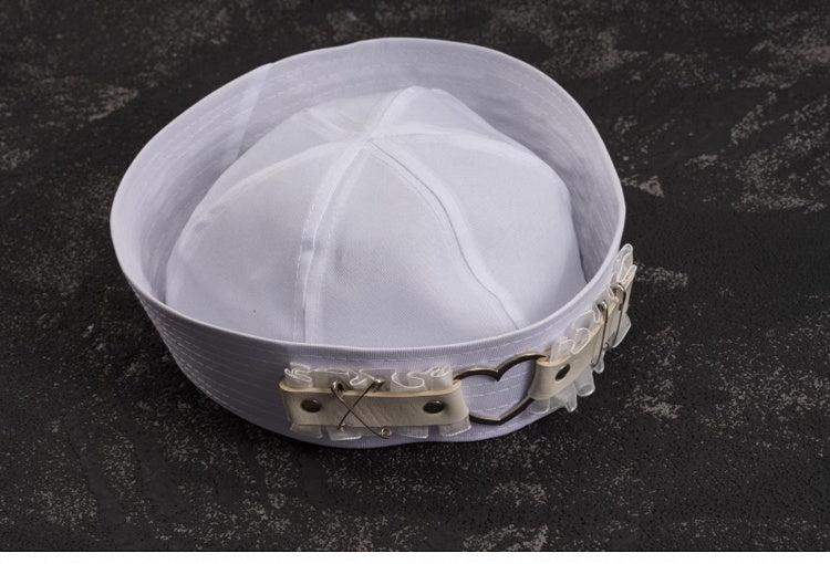 ホワイトのハート型リングスタッドピンとレースセーラーハットは、どんな装いにも愛らしさを添えてくれます。繊細なレースで仕立てられており、セーラー風のルックにぴったりです。ハート型のリングスタッドが、遊び心とチャーミングな雰囲気をスタイルにプラスします。