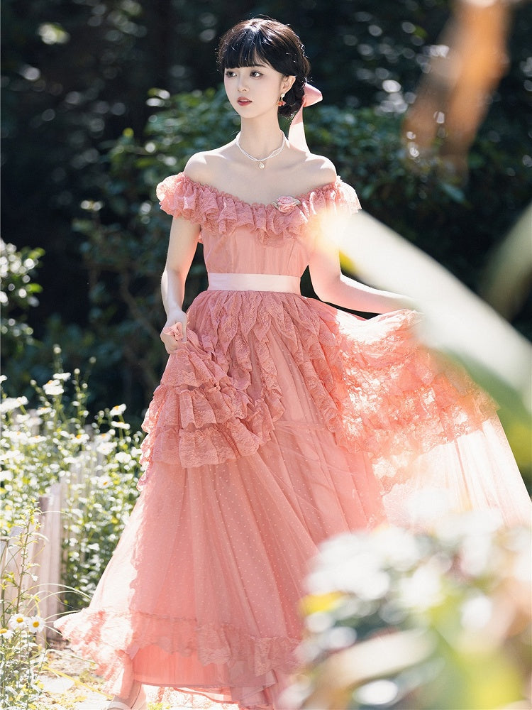 ワインレッド/ピンクのヴィンテージレースフリルトリムオフショルダーネックラインドレス