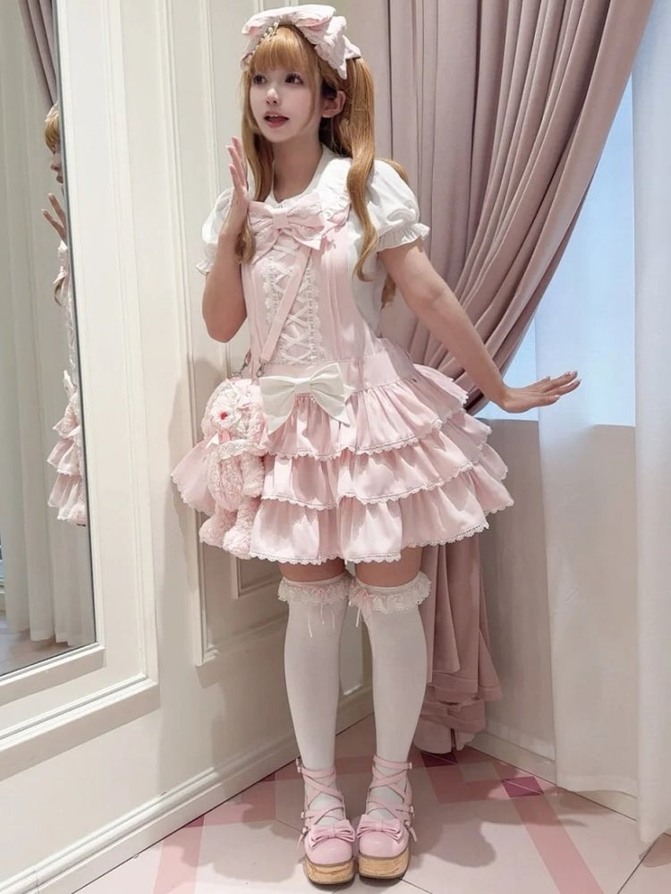 ピンクと白のオールドスクールロリータファッションドレス、蝶結びディテール、ロリータJSKセット