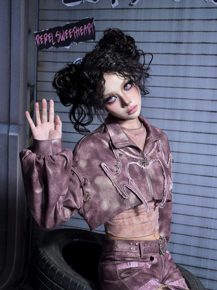with Sleeves Applique Denim Punk Cutout Pink Y2K Dusty Bishop Jacket Crop Pastel Heart Distressed