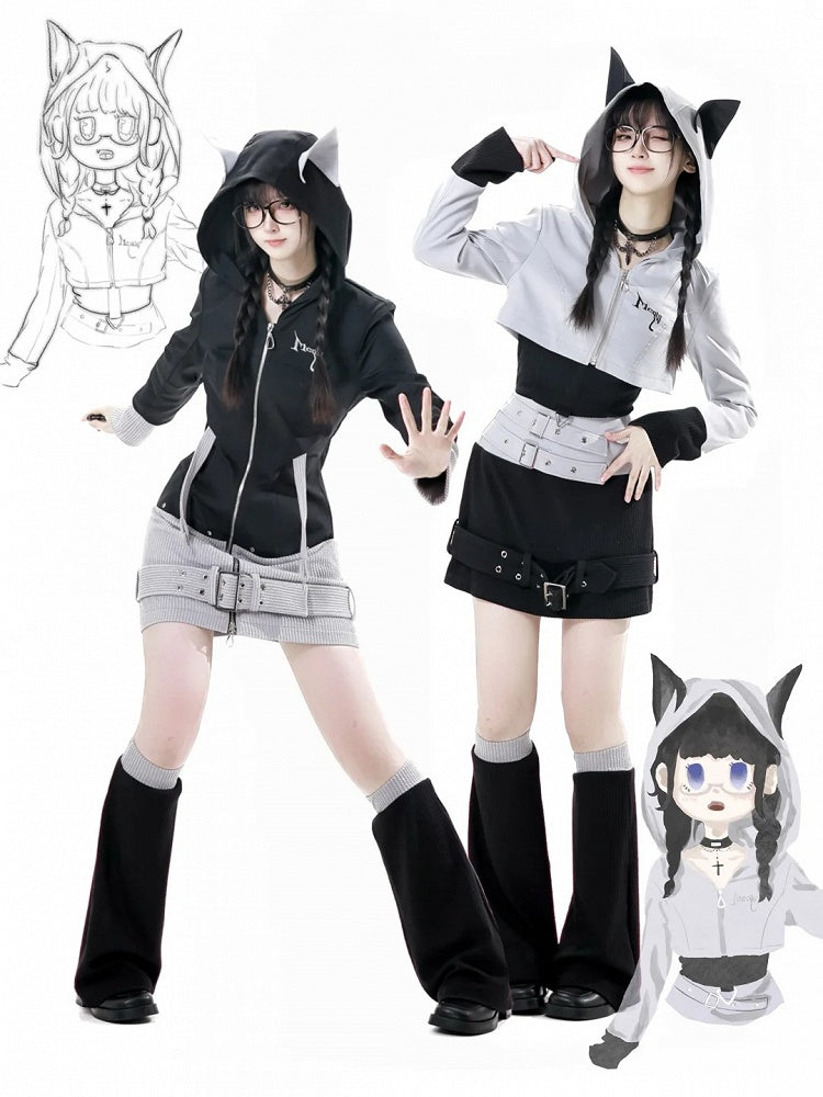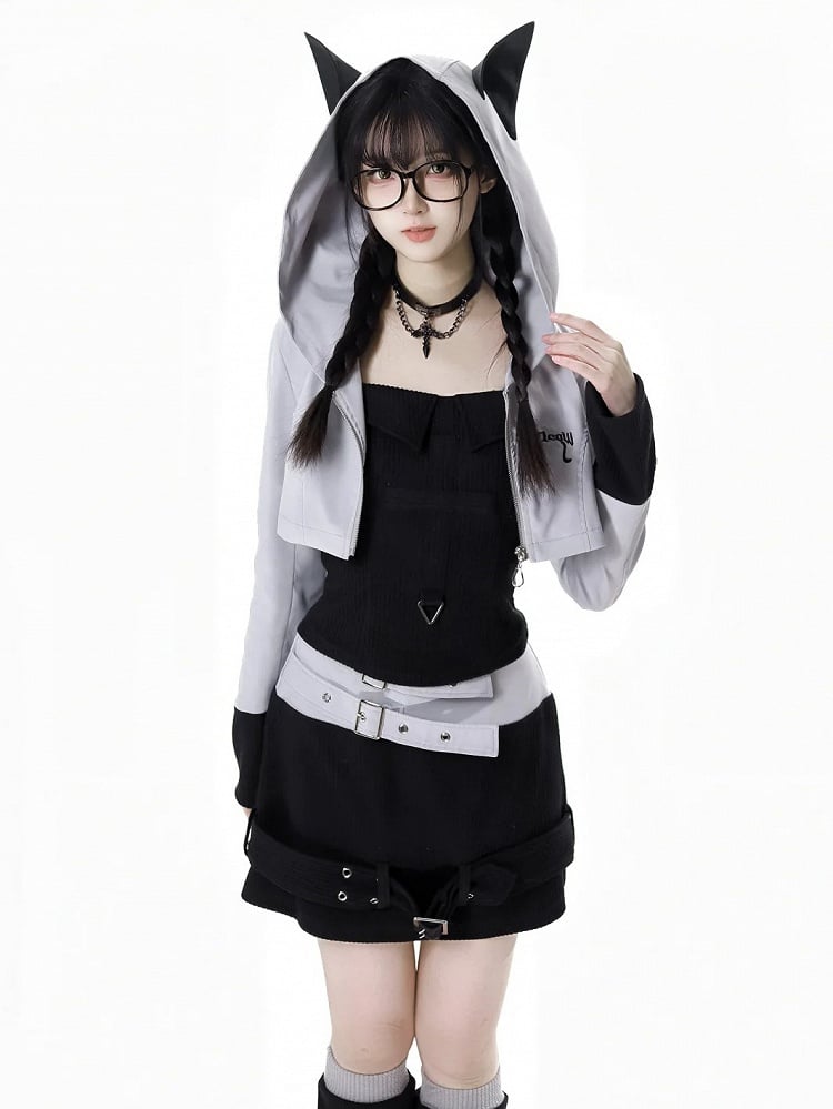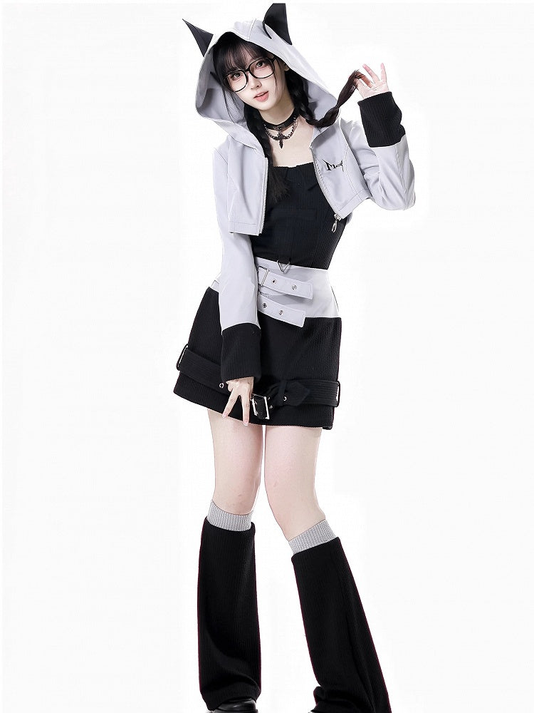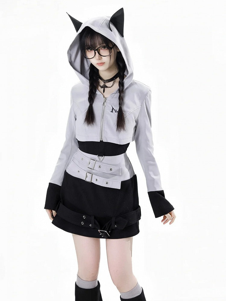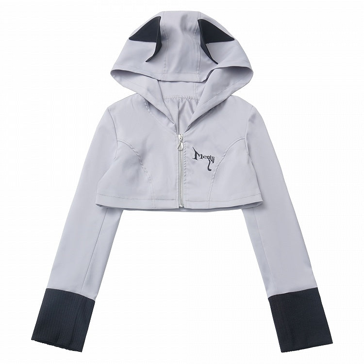 ウルフイヤーズデザイン フード付きグレー ジップクロージャー クロップドジャケット