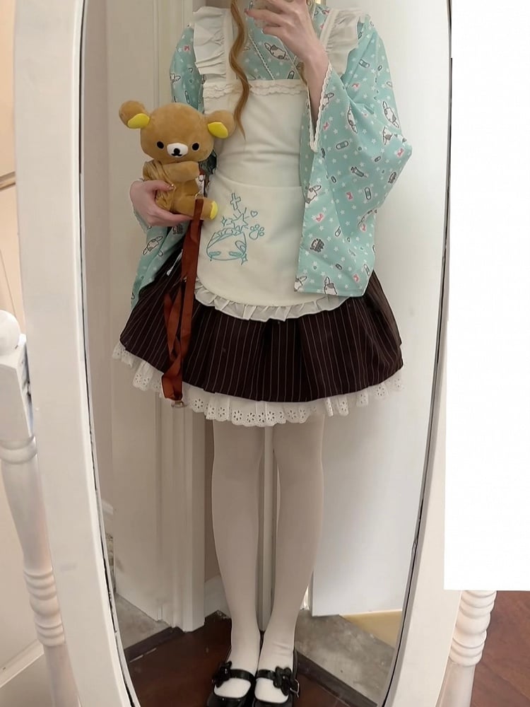 Maid-Inspired Kimono Style 3-Piece Set: Mint Green Wrap Top, Brown Striped Skirt & Cat Embroidered Apron