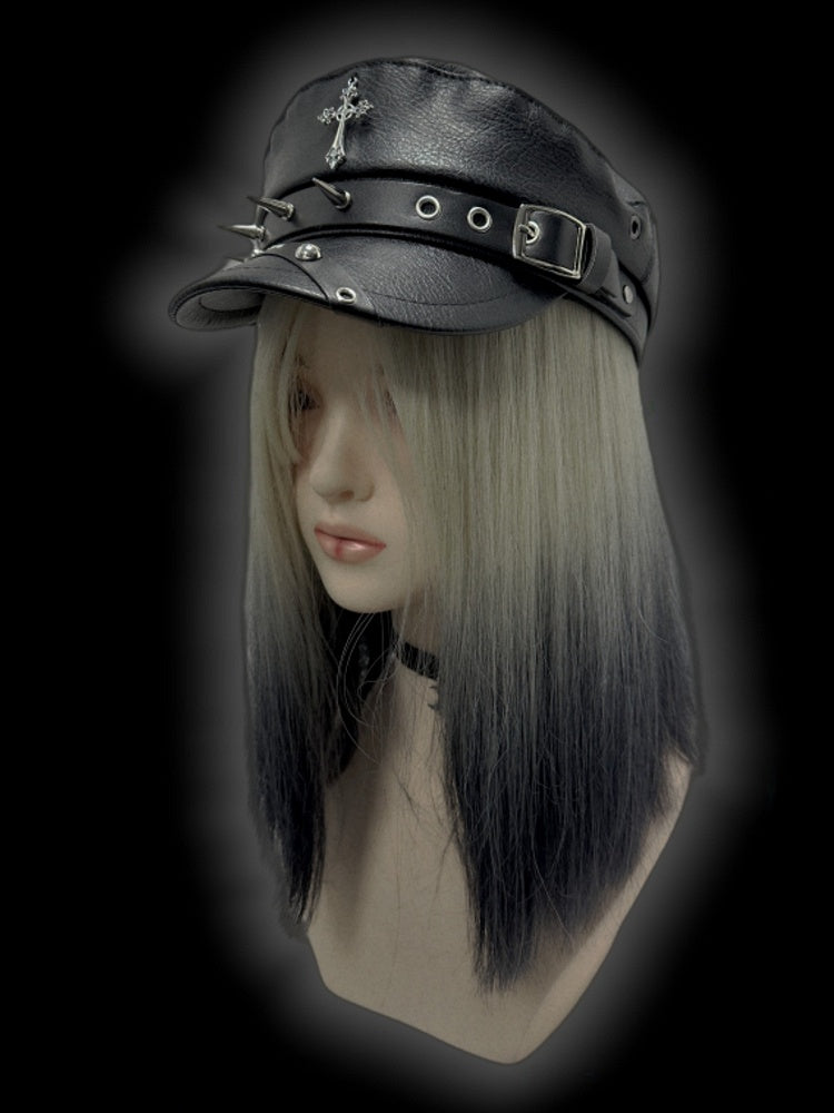 Y2K ブラッククロスチャームバックルストラップスタッド付きパンクベレー帽