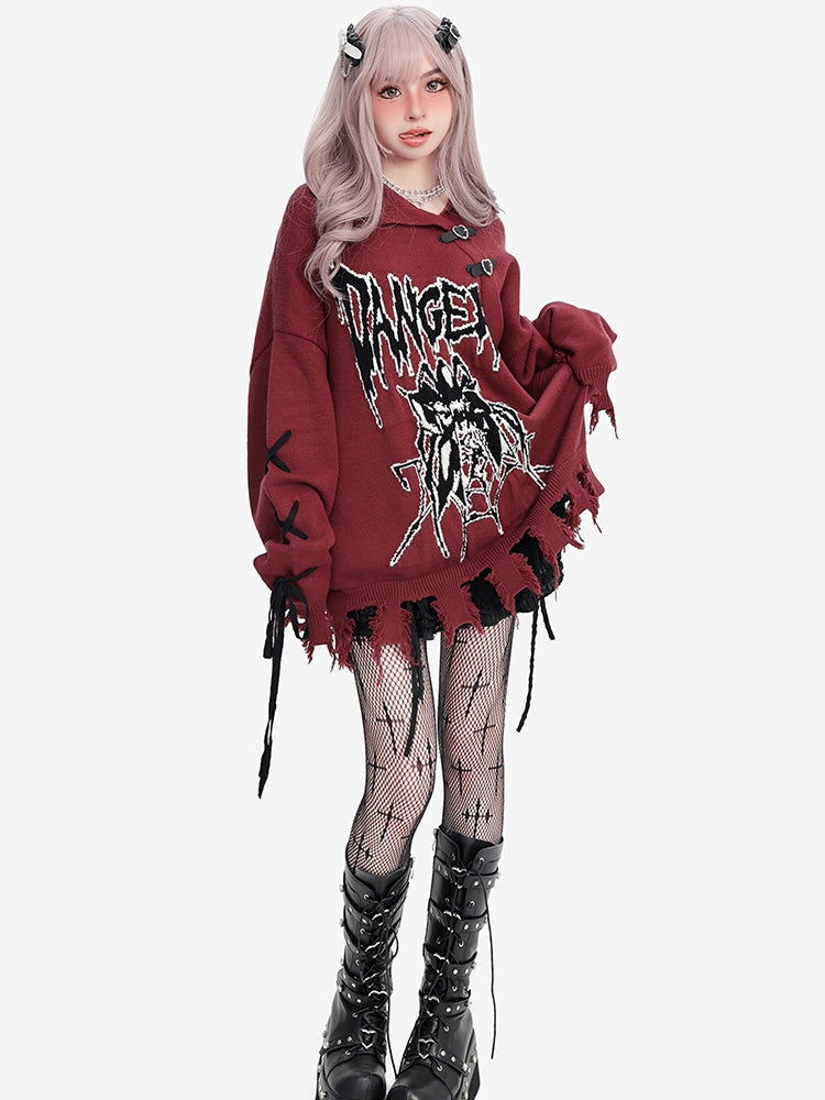 Y2K ダークレッド スパイダー柄 ディストレストリム ルーズセーター レースアップディテールスリーブ