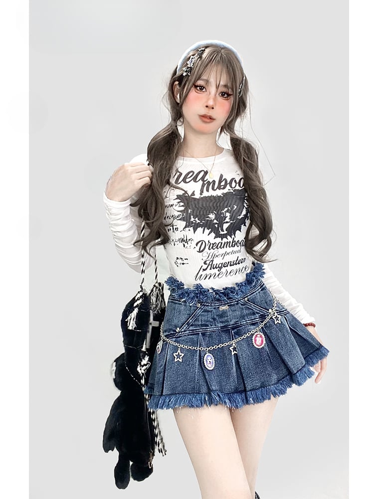 Y2Kヴィンテージ ダークブルー ディストレストトリム デニム グラマラススカート+バックルストラップ プラッシュトリム レッグウォーマー