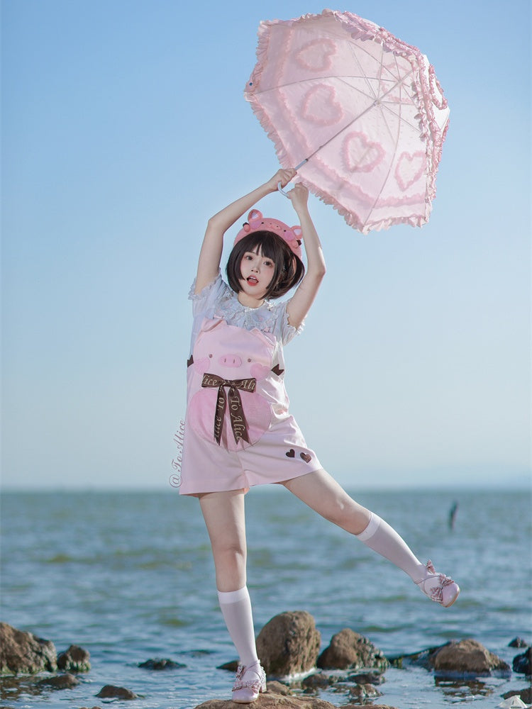 Adorable Piggy Pattern Bubble Shorts Overalls Pink