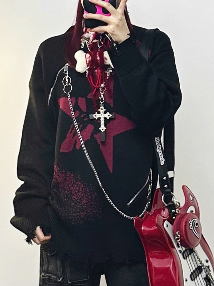 and Black/Gray Distressed Knit Sweater with Zipper Chain Detail