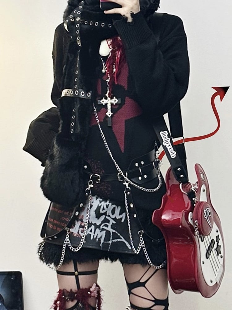 Black/Gray Distressed Knit Sweater with Zipper and Chain Detail