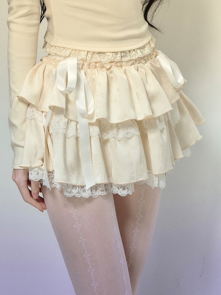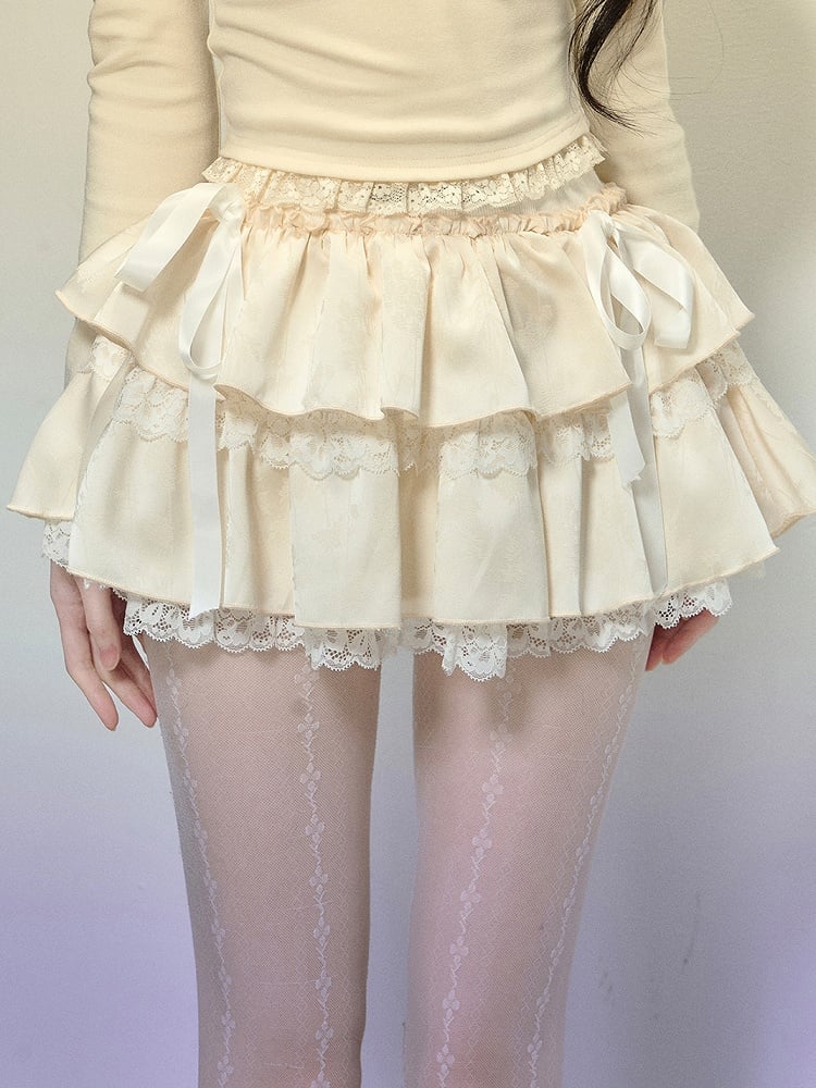 Apricot Bow Accents Lace Trim Tiered Mini Skirt