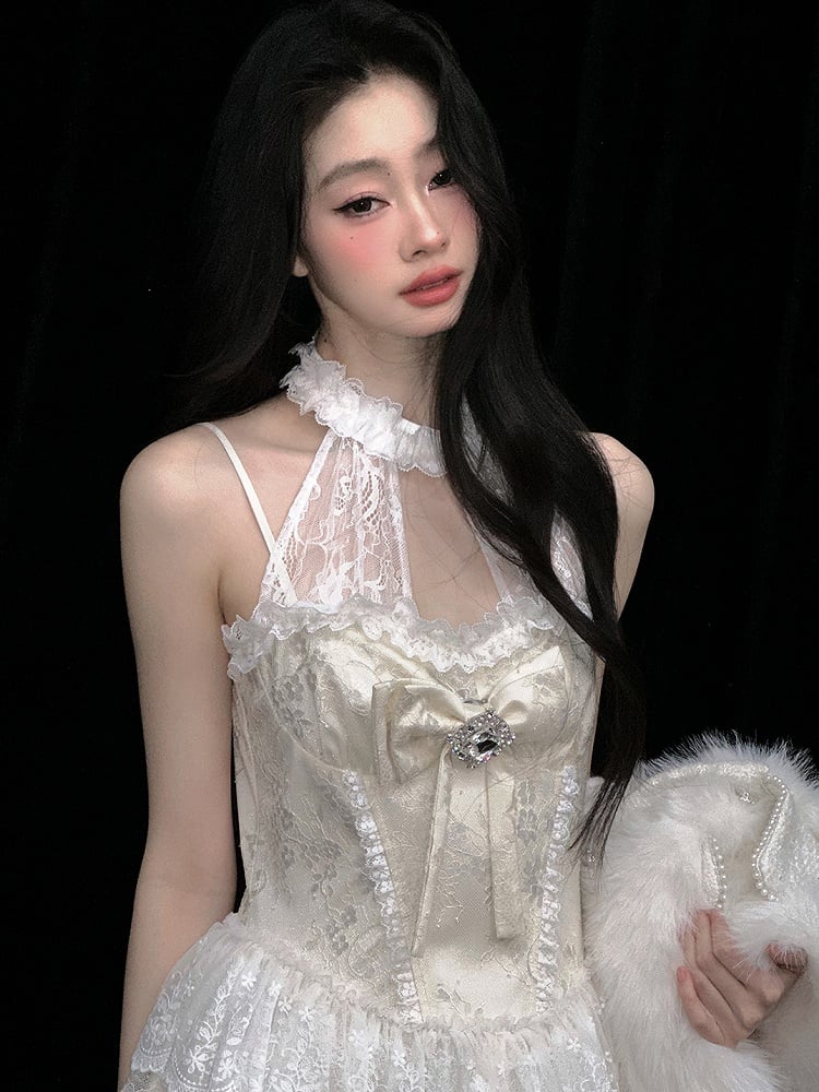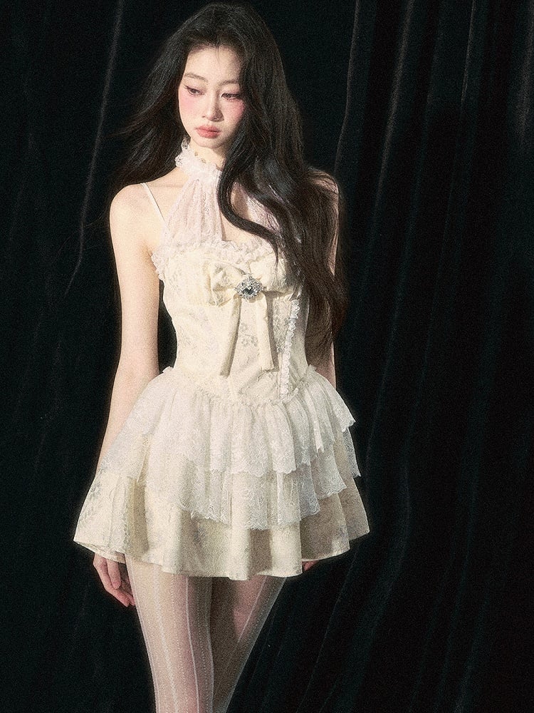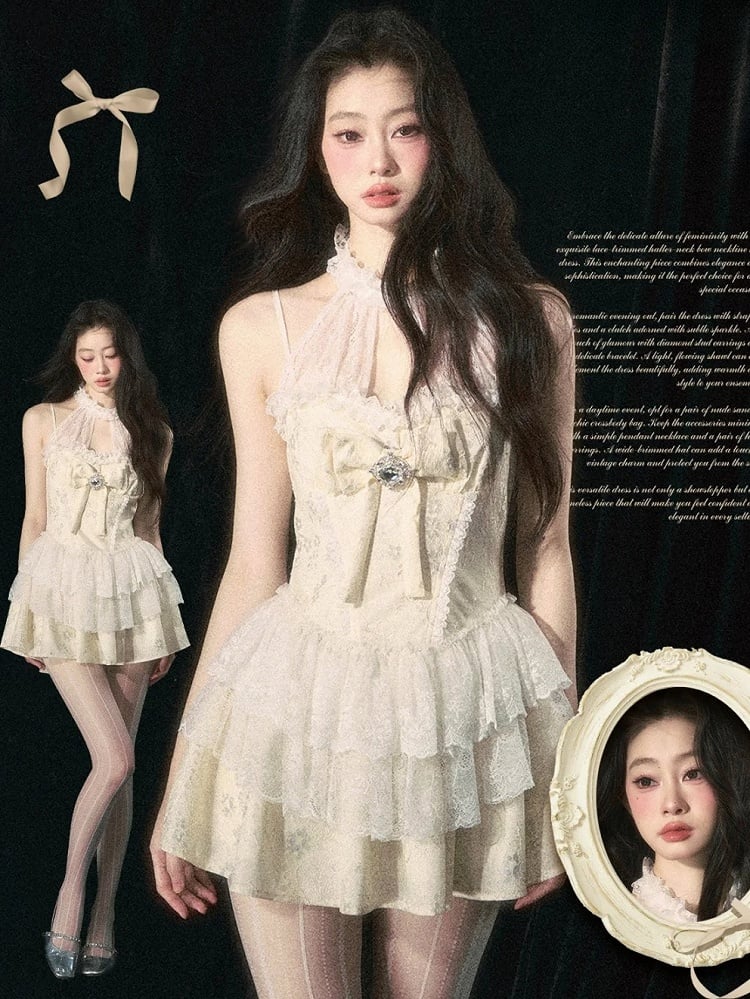 Apricot Halter Neck Bowknot Tiered Skirt Dress
