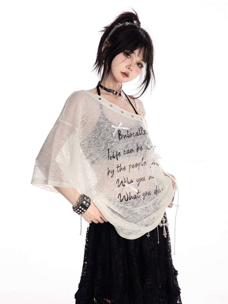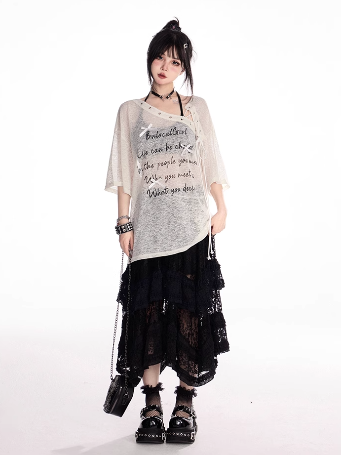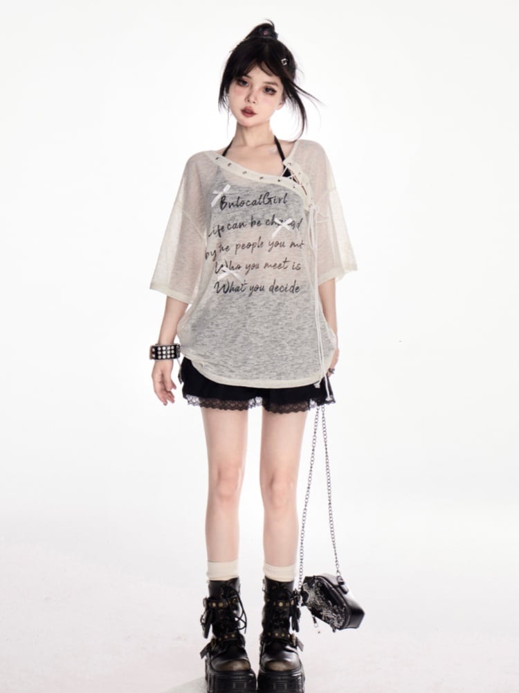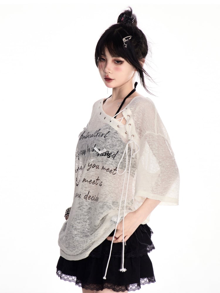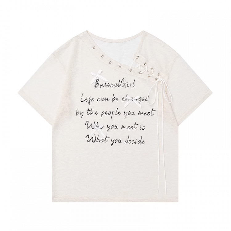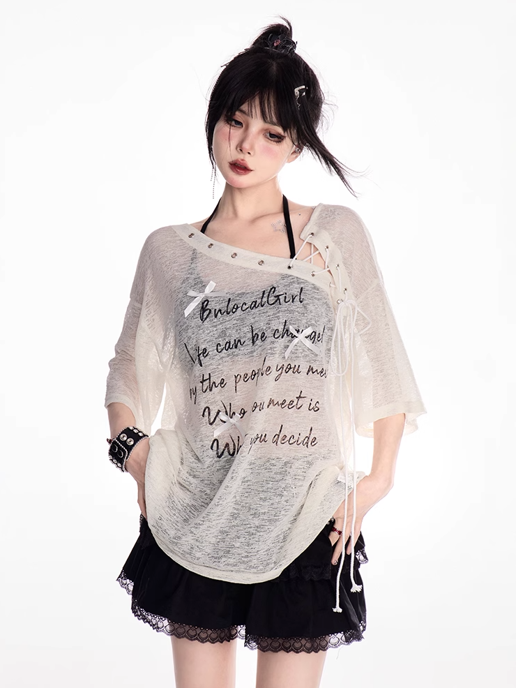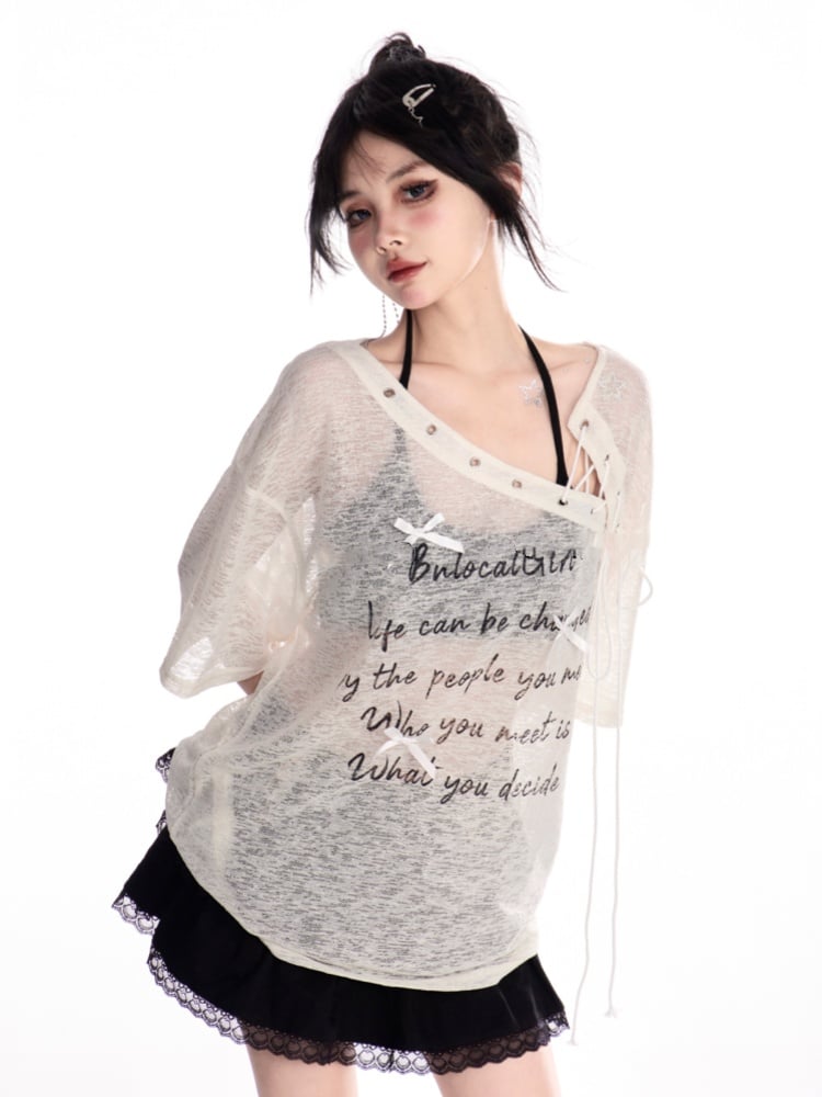 Apricot Lace-up Asymmetrical Neckline Letter Print Semi-sheer