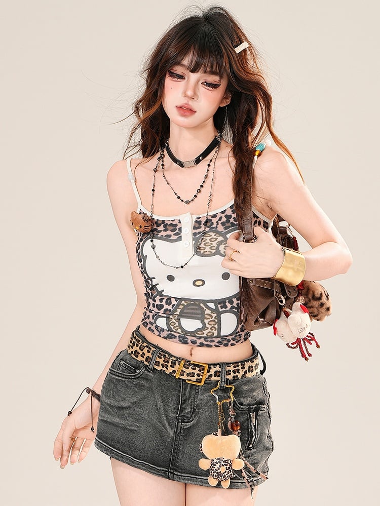 Gyaru Fashion Apricot Glamorous Kitty Print Leopard Pattern Cami Top