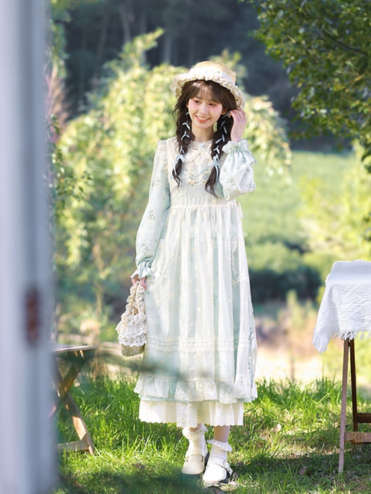 This lovely apricot overdress features a cute Peter Pan collar and delicate floral embroidery, adding a touch of charm to any outfit. With its soft fabric and intricate details, it's the perfect addition to your wardrobe for a sweet and elegant look.