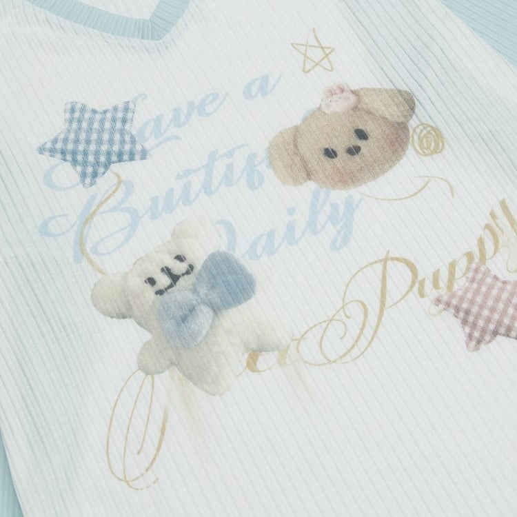 Apricot/Pink/Green Kawaii V-Neck Knit Top with Puppy Print - Long Sleeve Pullover