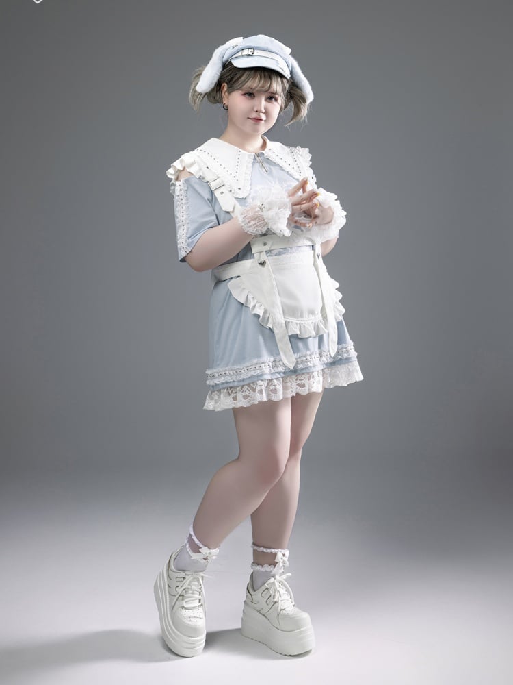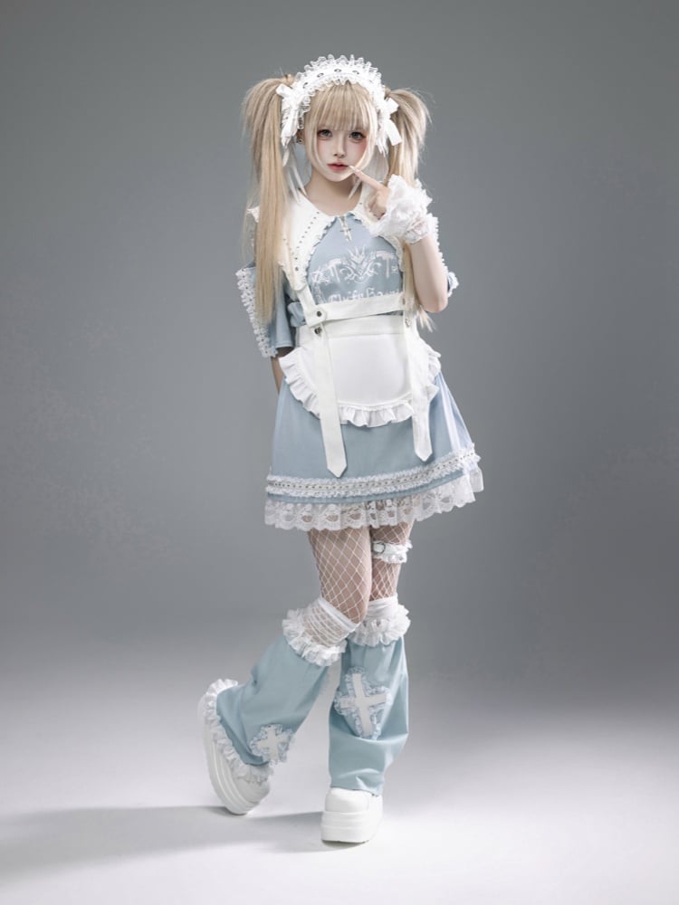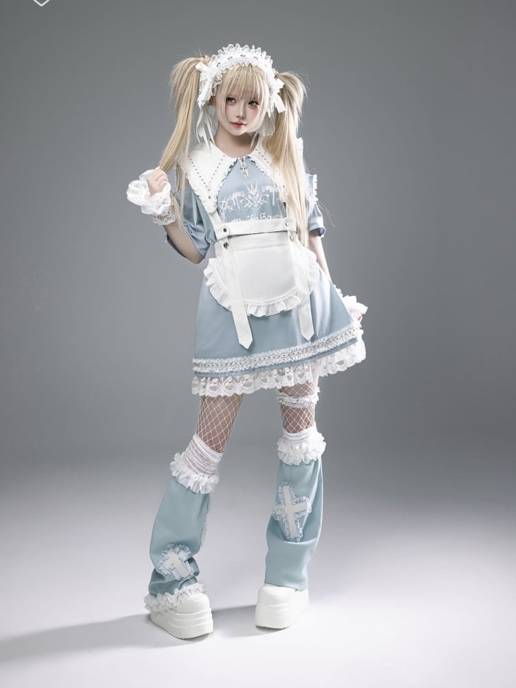 Blue and White Old School Lolita Fashion Dress Bowknot Detais JSK Set