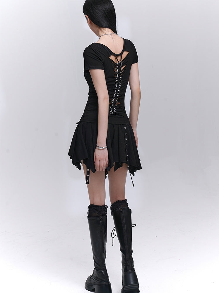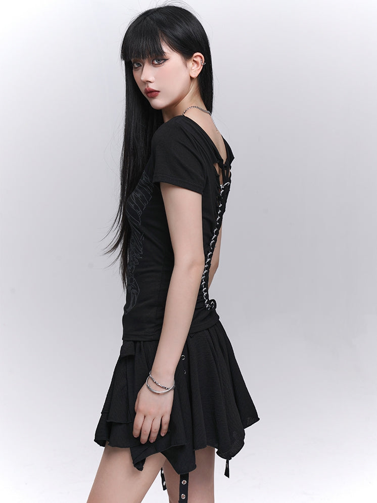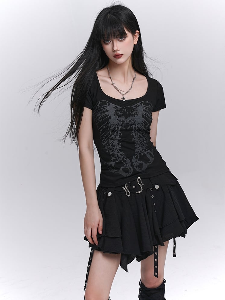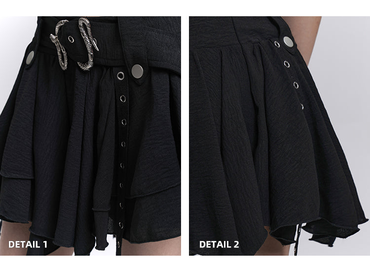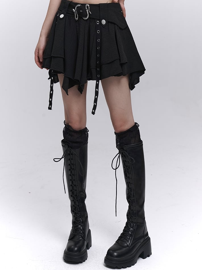 Black Asymmetrical Hem Tiered Skirt with Serpentine Belt