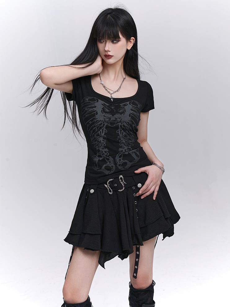 Asymmetrical Hem Tiered Skirt with Black Serpentine Belt