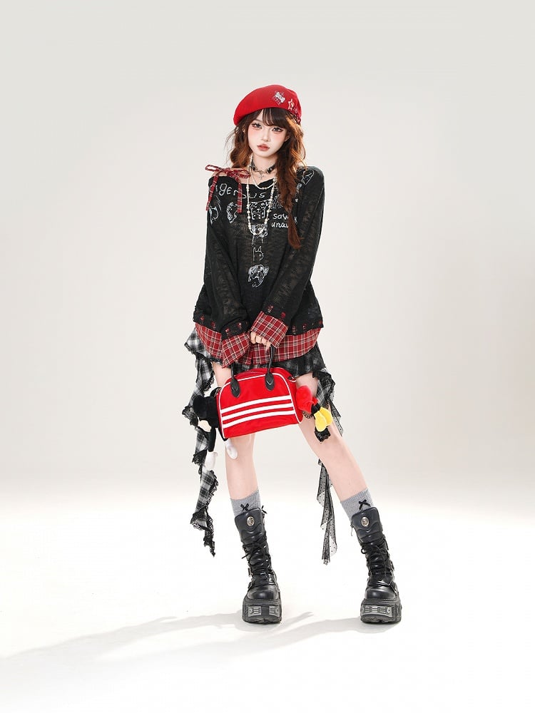 Asymmetrical Neckline Puppy Print Beige/Black Hem Plaid