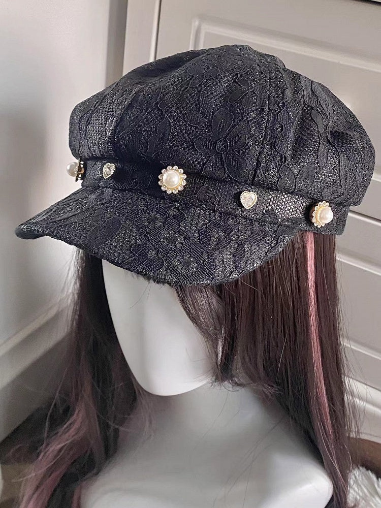 Bead Kei Black Eight-panel Embellishment Hat with Beret Rhinestone Lace Jirai