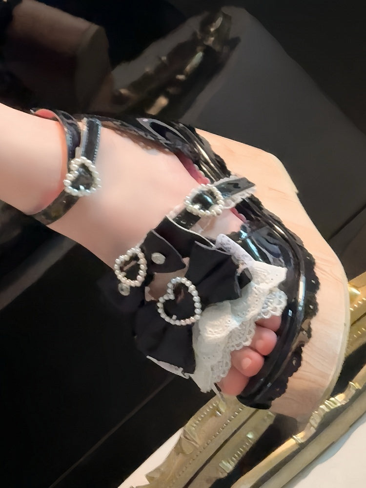 Black Showa-style Wedge Platform Sandals - Beaded Heart Buckles, Lace Trim & Bow Accents