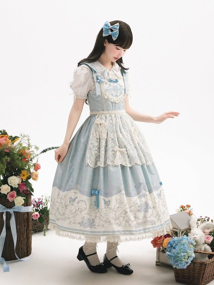 Blue and White Old School Lolita Fashion Dress Bowknot Detais JSK Set