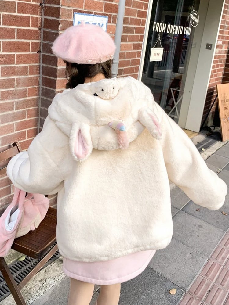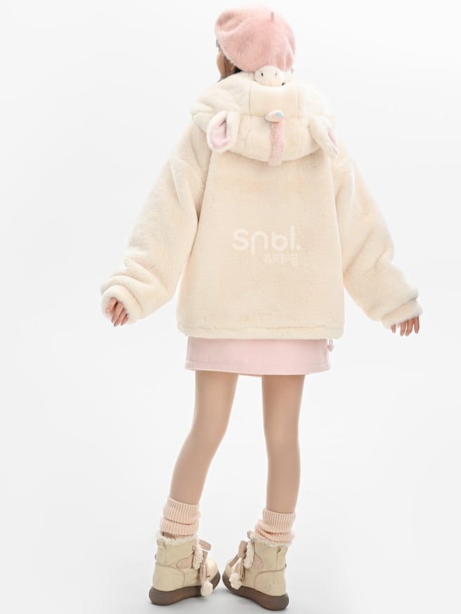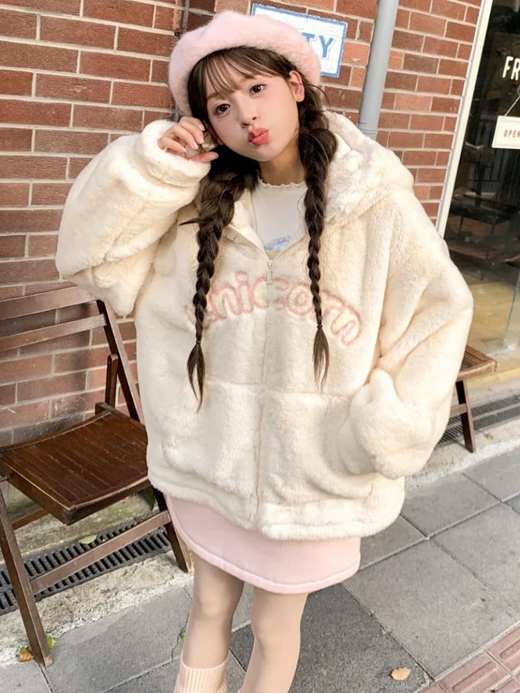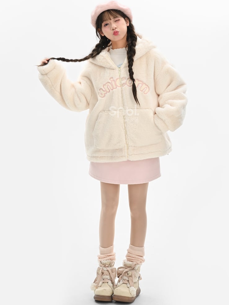 Beige Letters Pattern Unicorn Head Hood Fleece Zip Hoodie