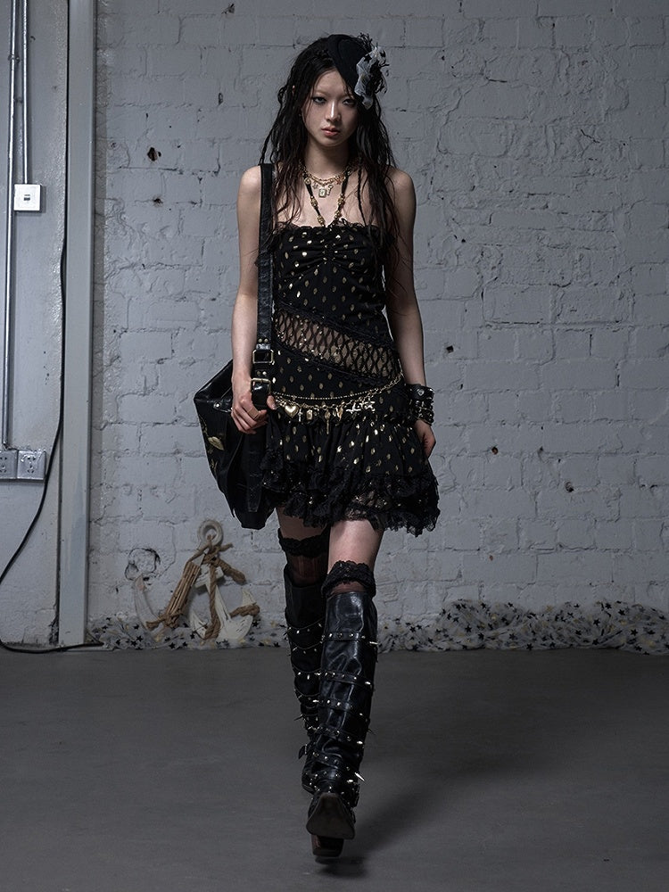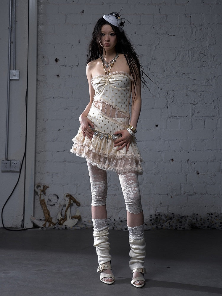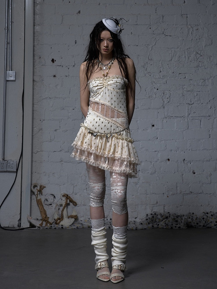 Beige/Black Halter Neck Lace Patches Waist Polka-dot Vintage Strapless Dress