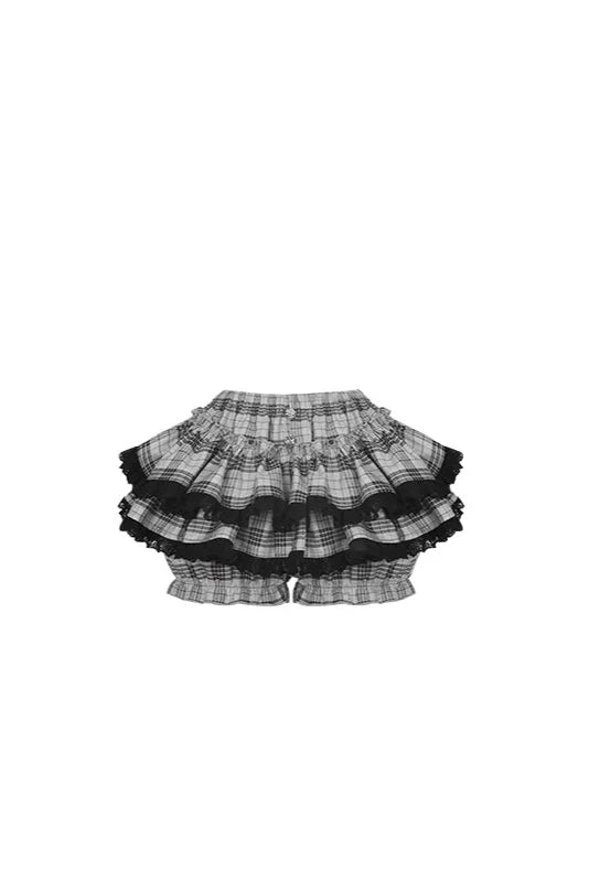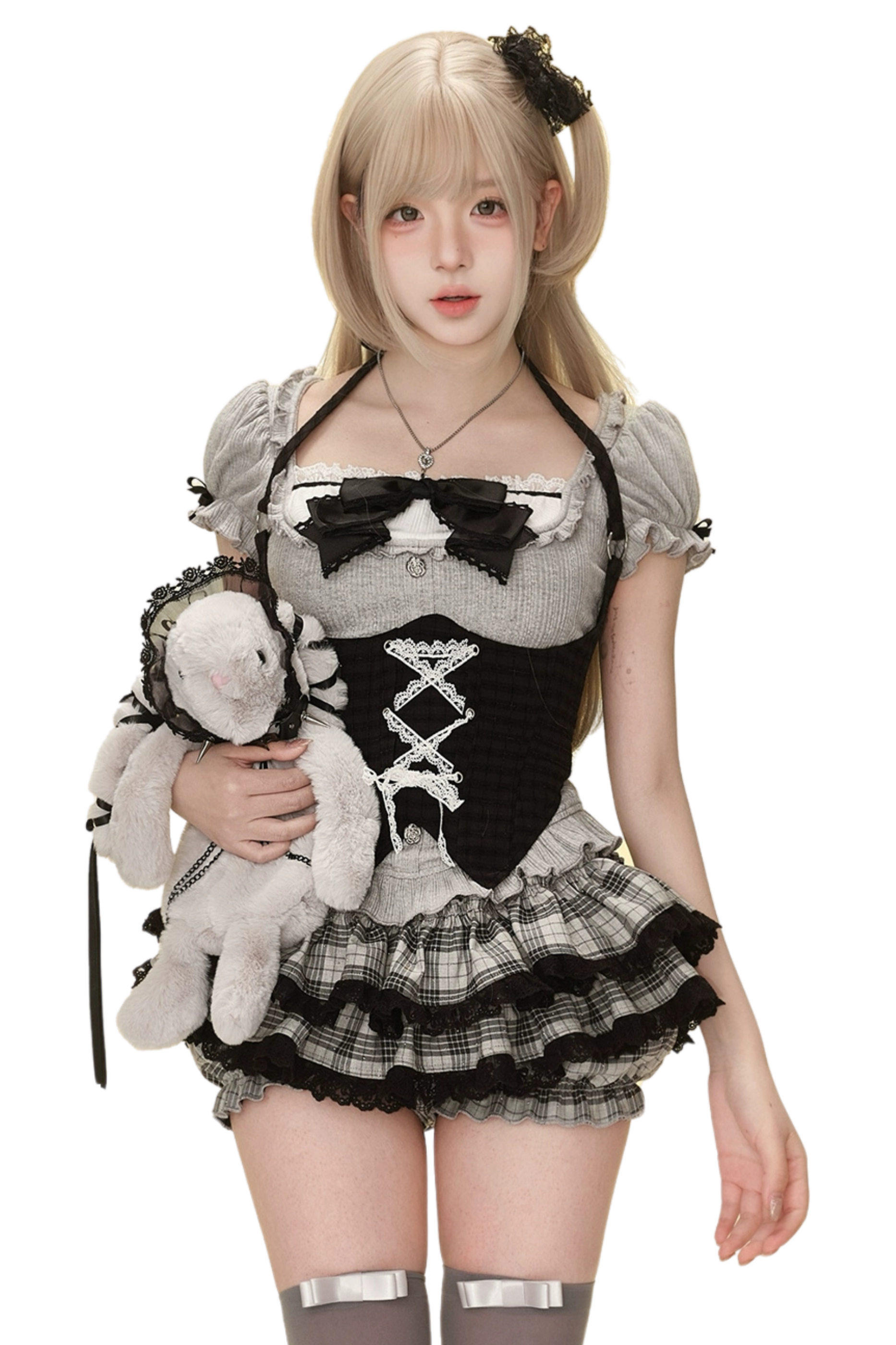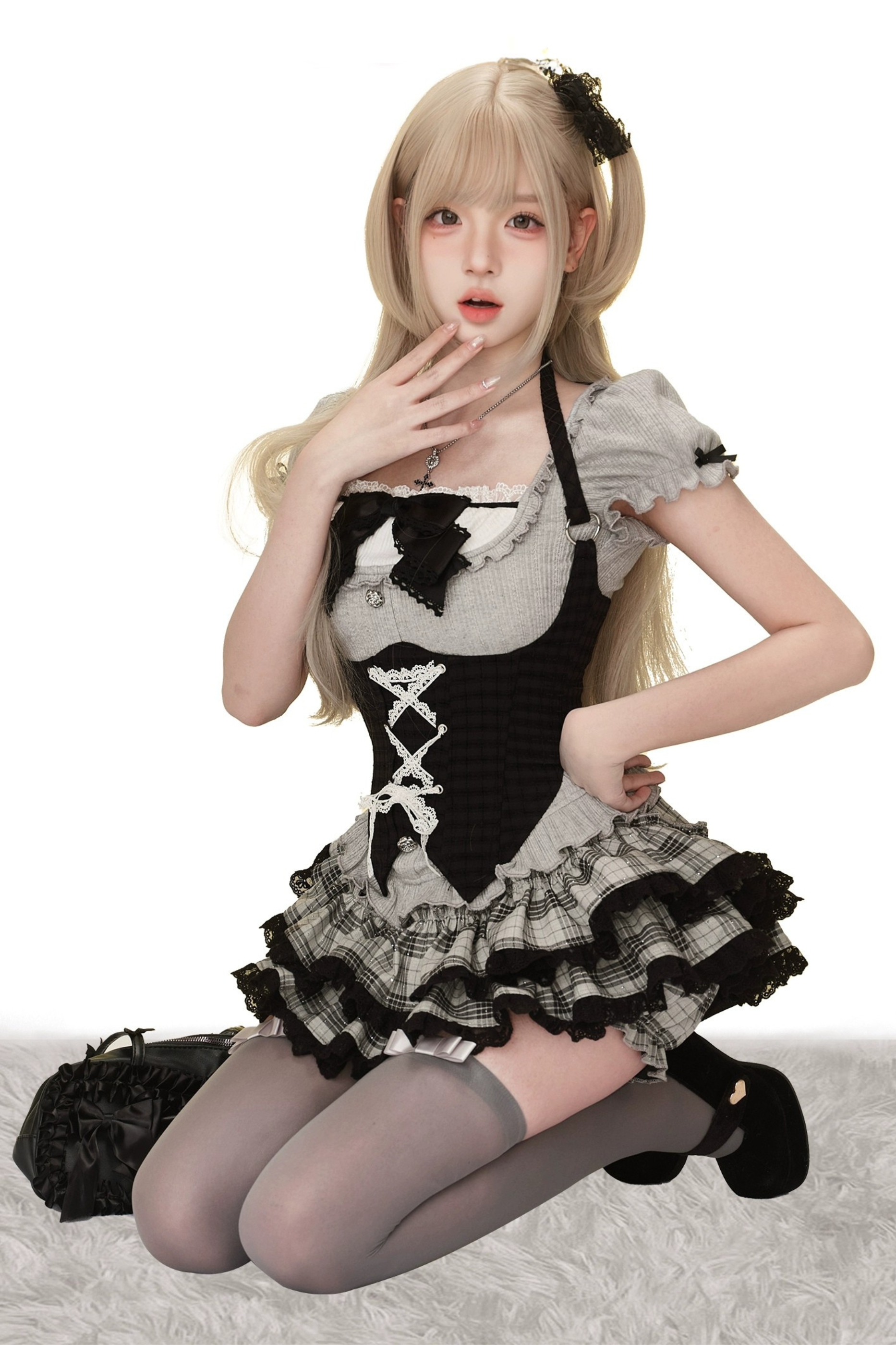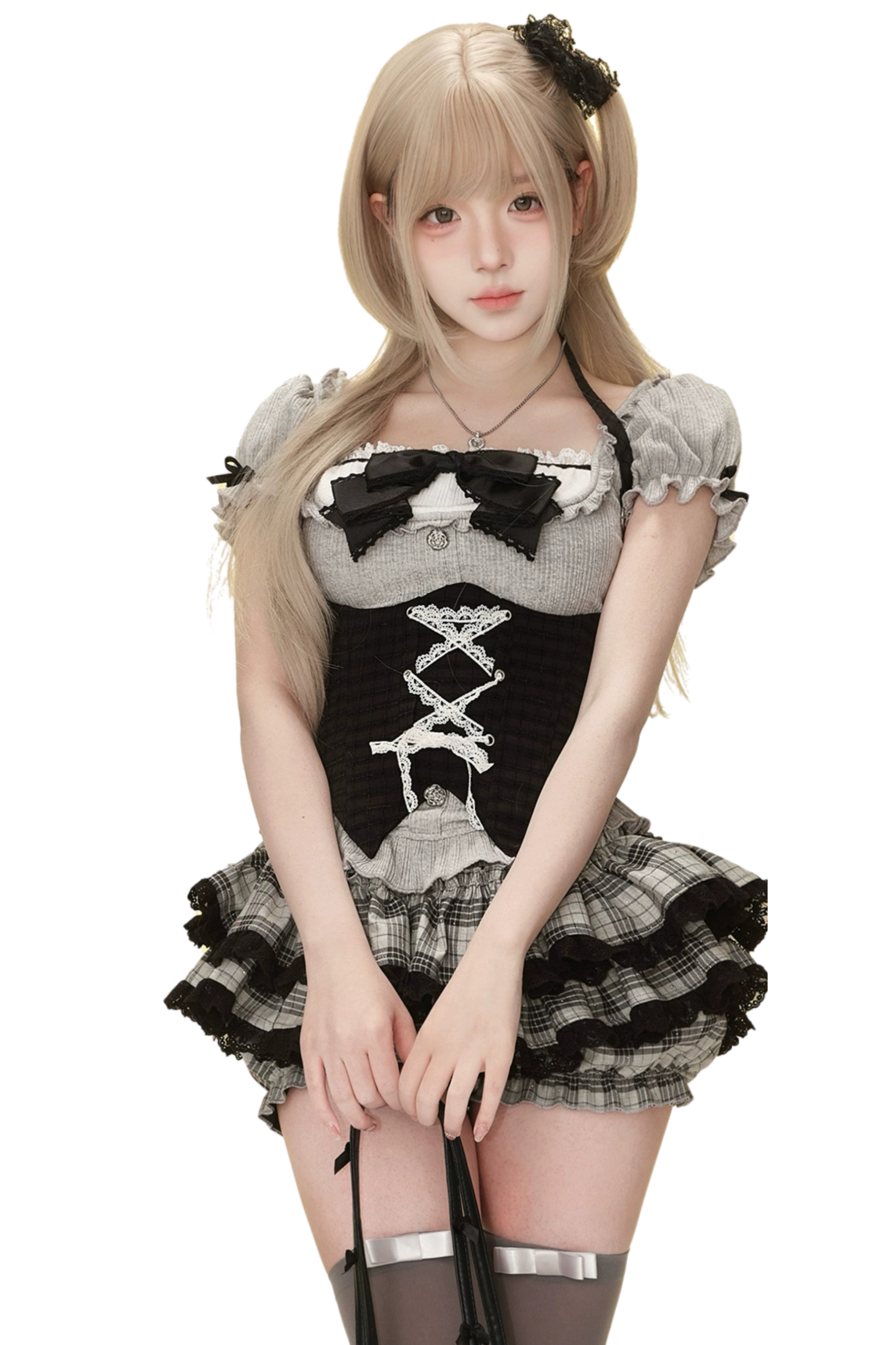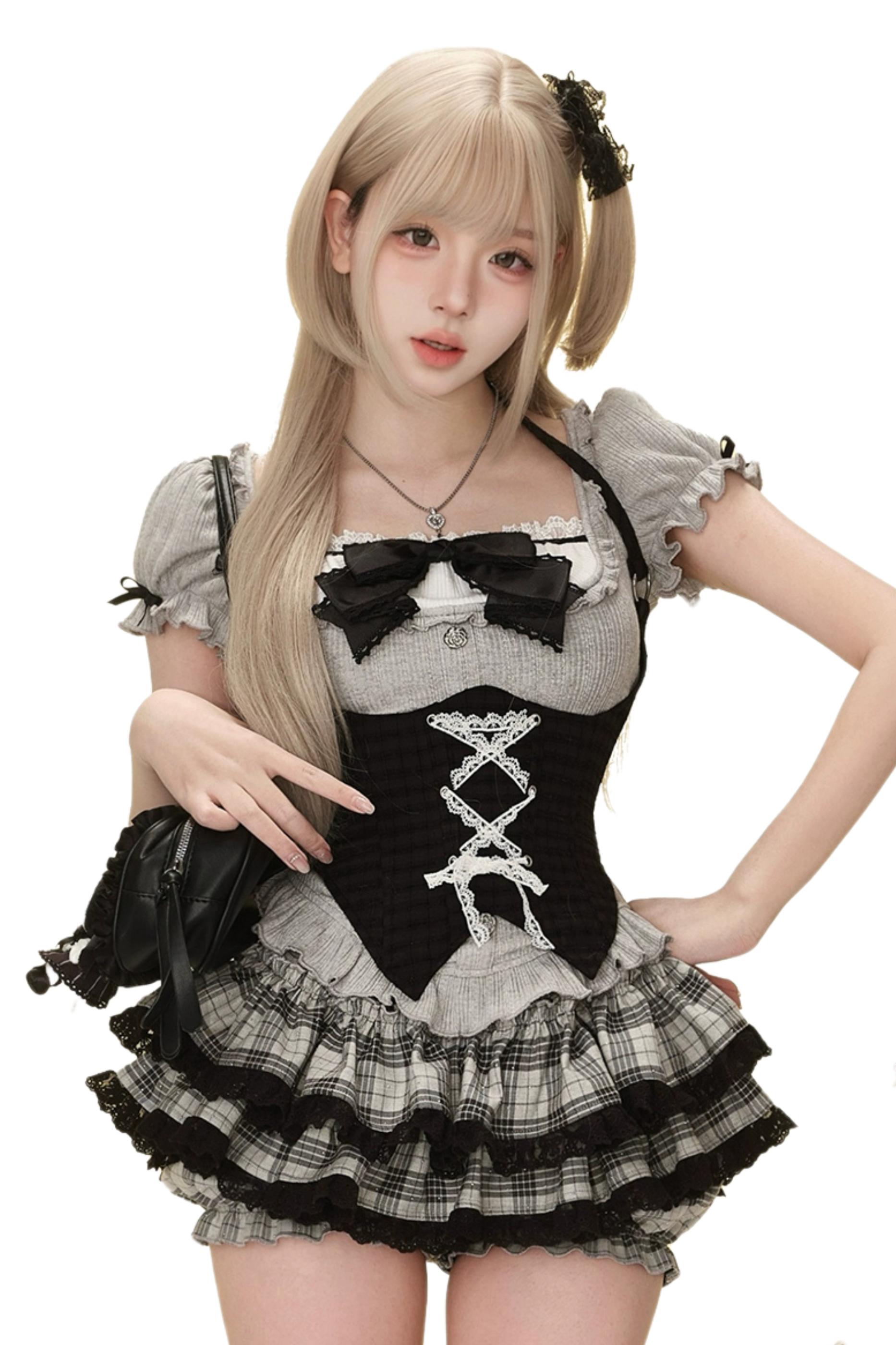 ❤Moonlight Secret Language Top + Black Waist Belt + Plaid Cake Skirt❤