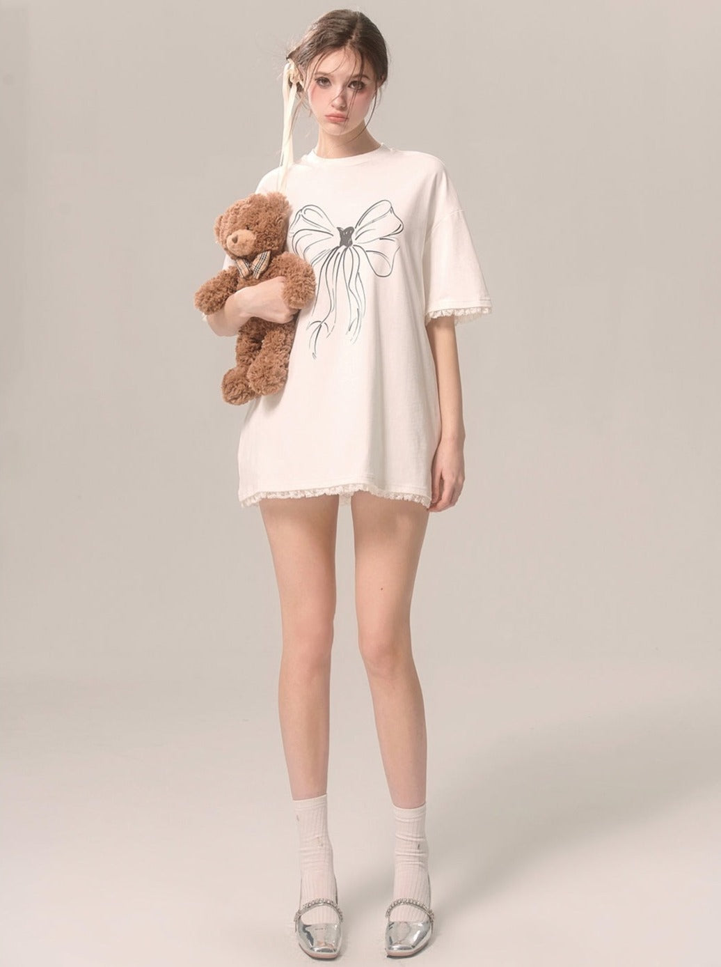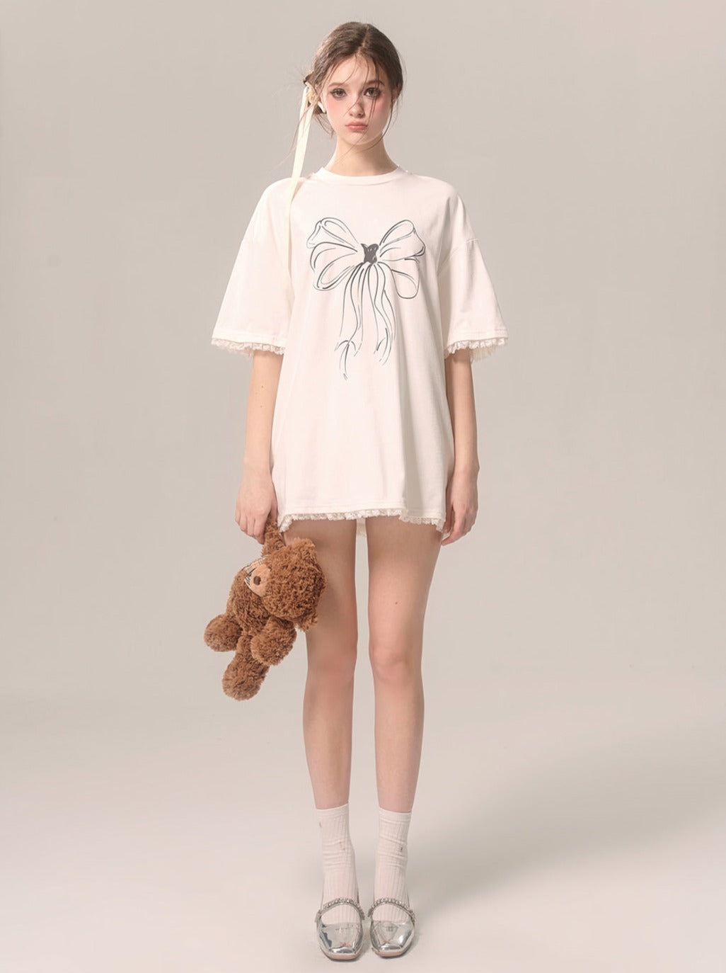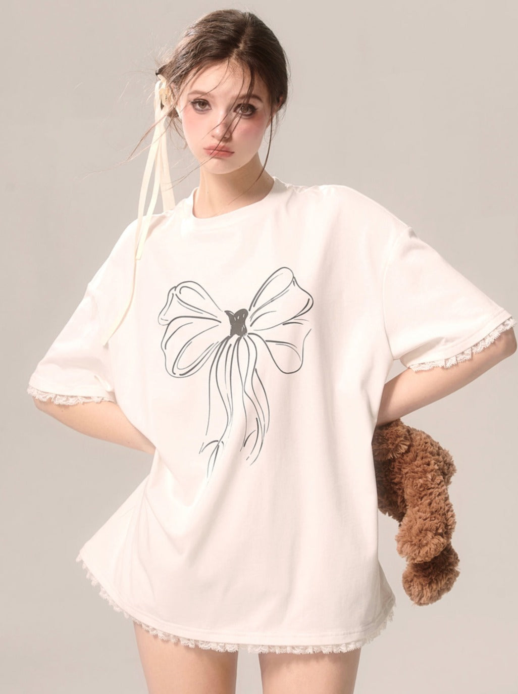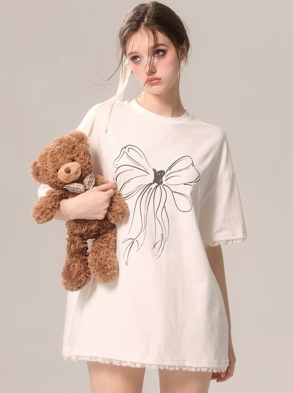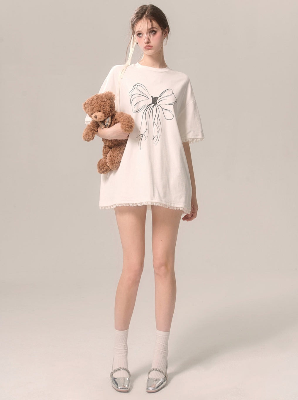 This cute Big Loose Illustration T-Shirt features a unique art ribbon design. Made with high quality materials, it's comfortable and stylish. Perfect for any casual occasion.