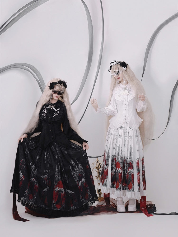 Black Angel Ruffled Pleat Box Gothic Skirt Red and Blouse Set Printed
