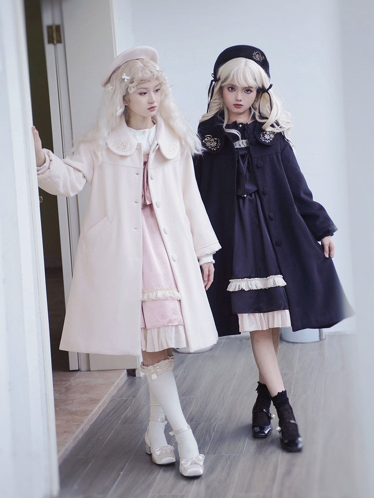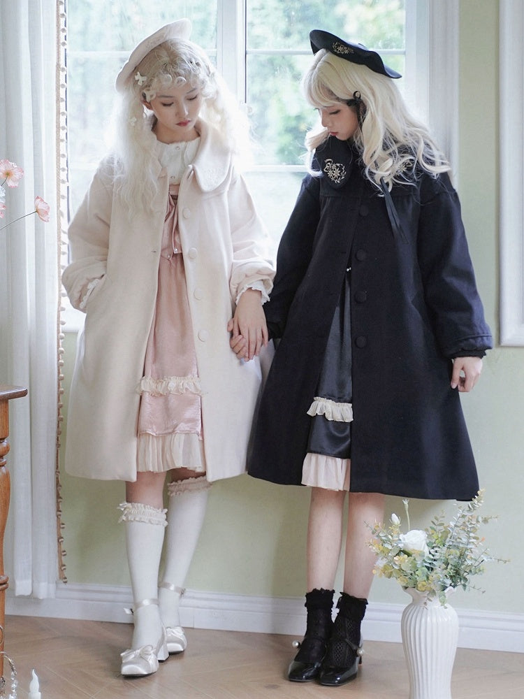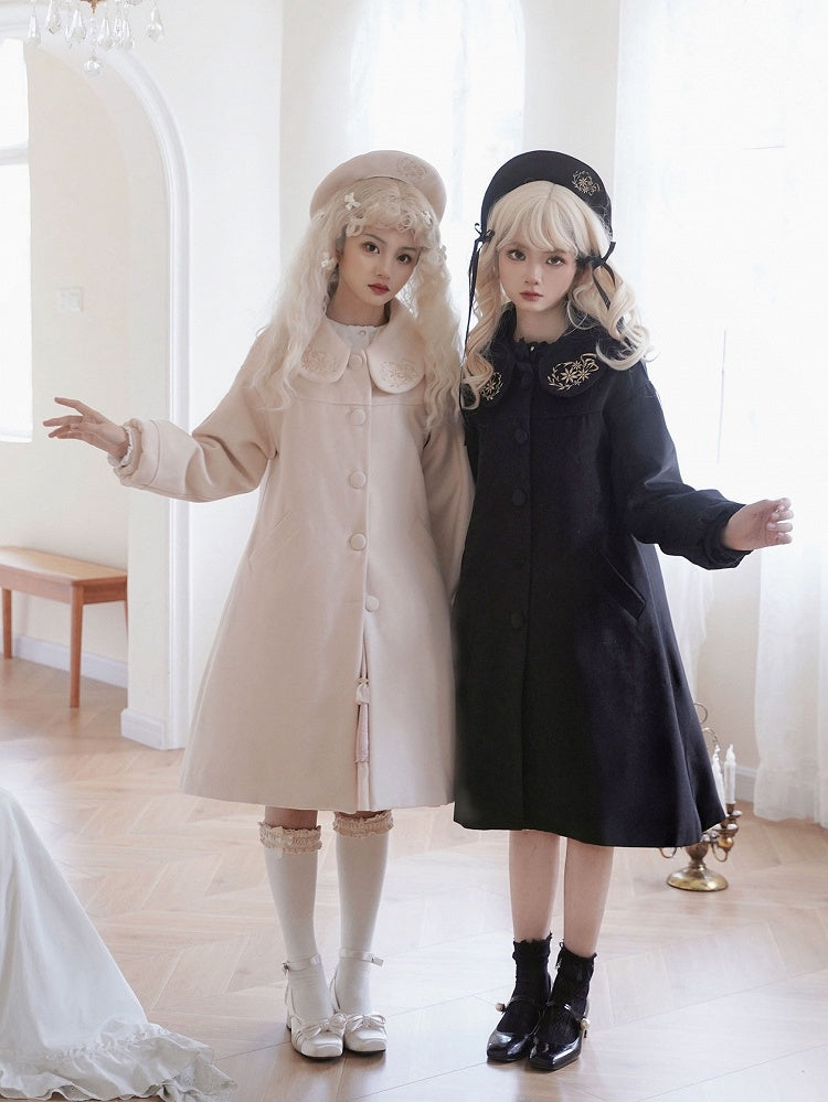 Black Delicate Floral Round Flat Collar Woolen Coat