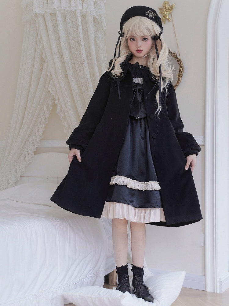 This lovely Black Delicate Floral Woolen Coat features a unique round flat collar and delicate floral pattern. It's the perfect combination of style and warmth, making it a must-have for any fashionable and adorable wardrobe.