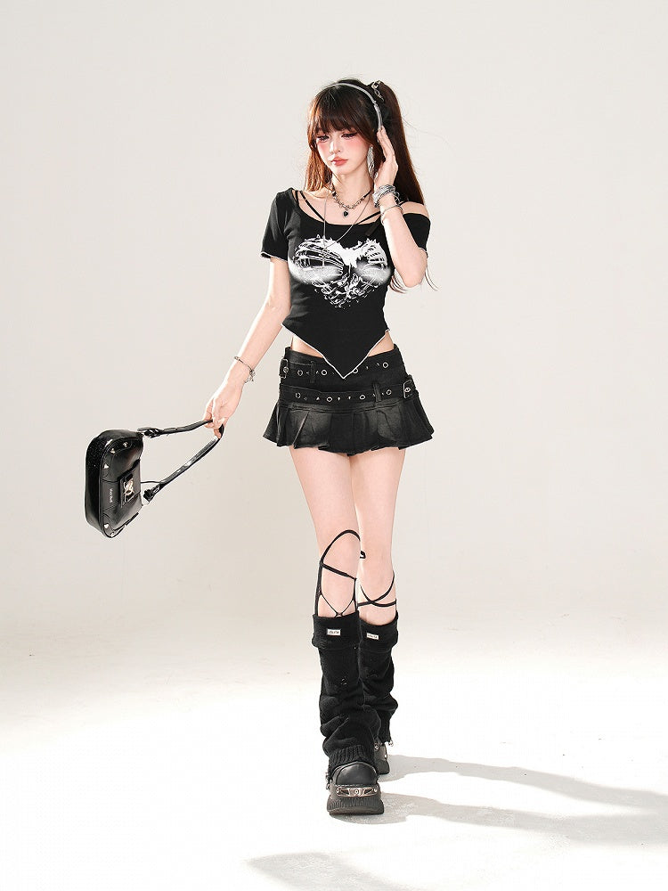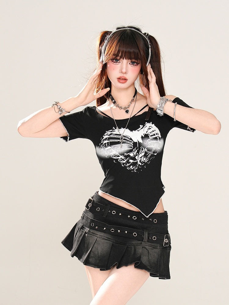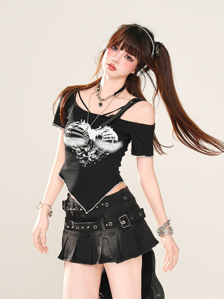 Black/White Asymmetrical Neckline Curved Hem Glamorous Graphic T-shirt