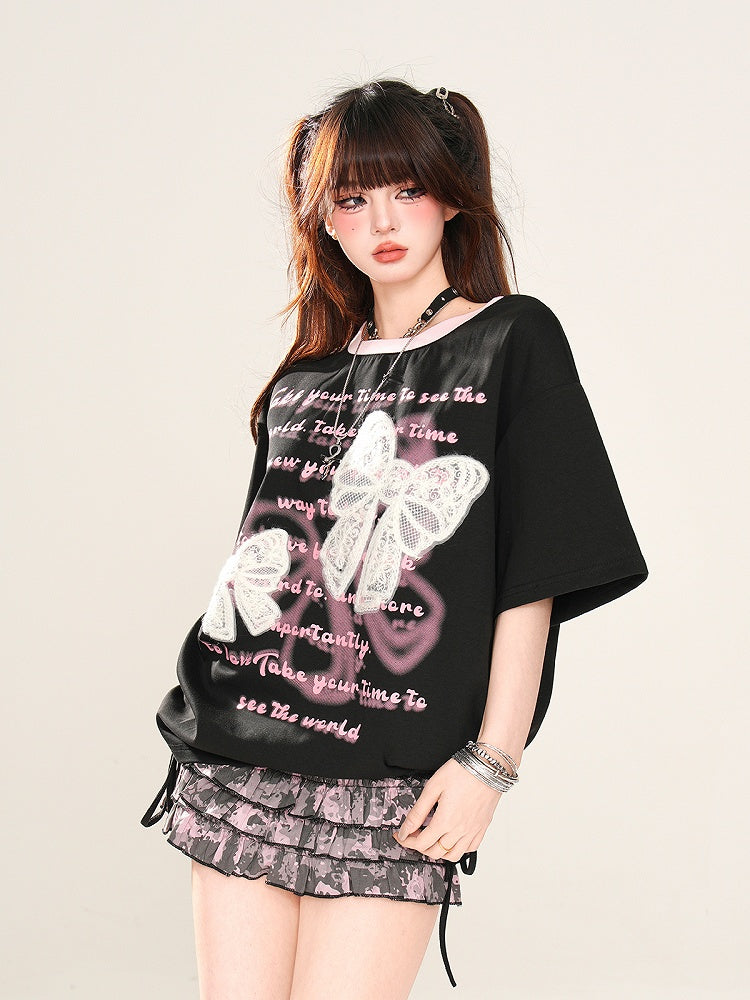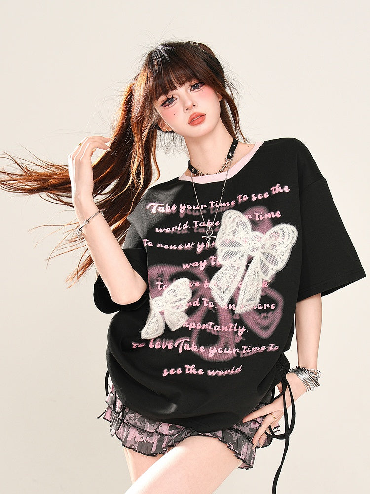 Black/White Lace Bow Appliques Drawstring Waist Sweet Graphic T-Shirt