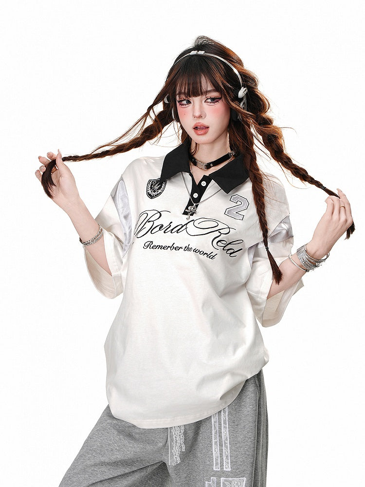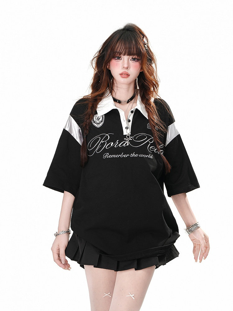 Black/White Polo Collar Preppy Style Sports T-Shirt