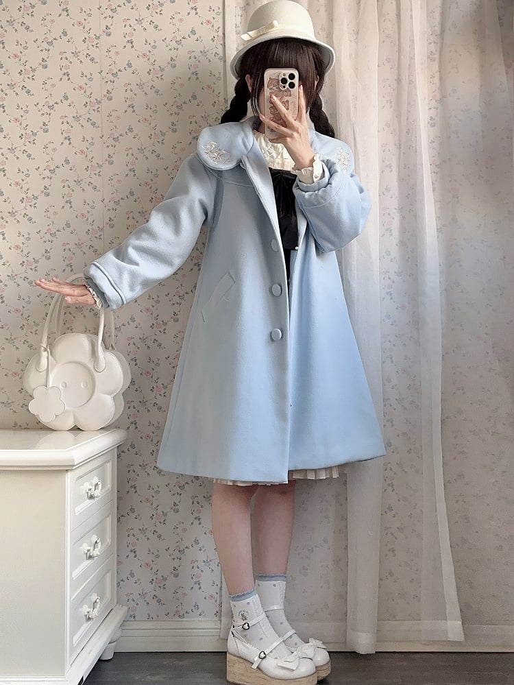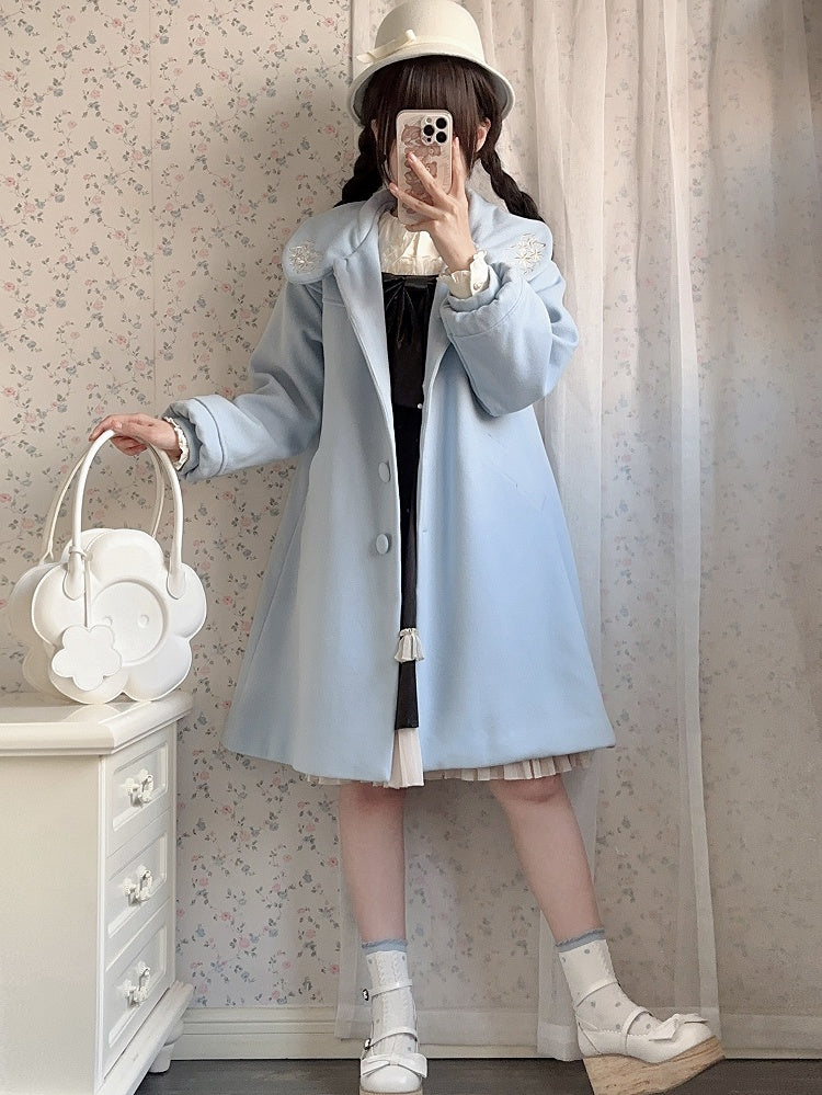 This cute Blue Delicate Floral Round Flat Collar Woolen Coat is the perfect addition to your winter wardrobe. Made with high-quality wool, it will keep you warm and stylish all season long. The delicate floral design adds a touch of whimsy to your outfit, making it a charming and versatile piece.