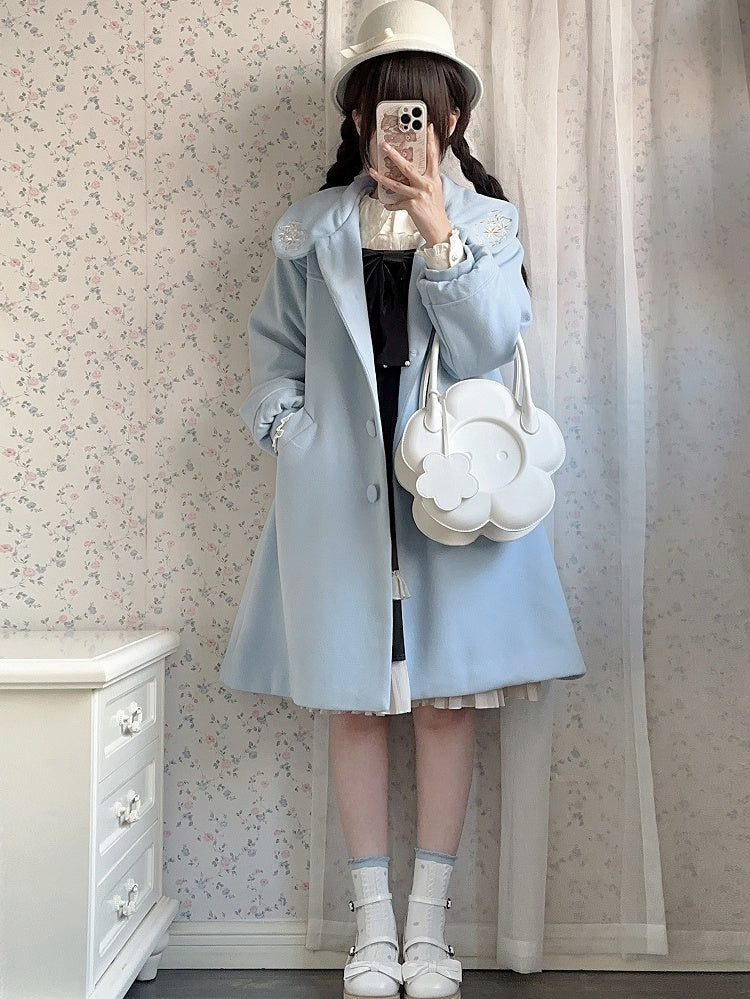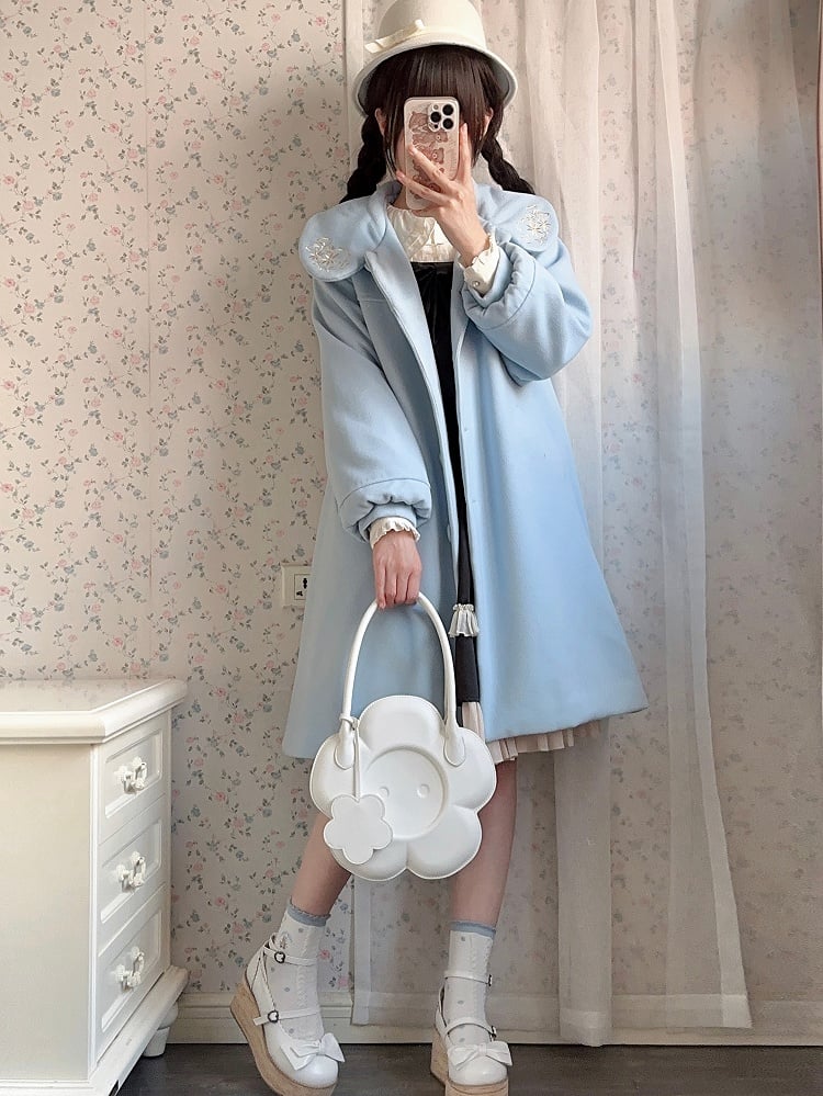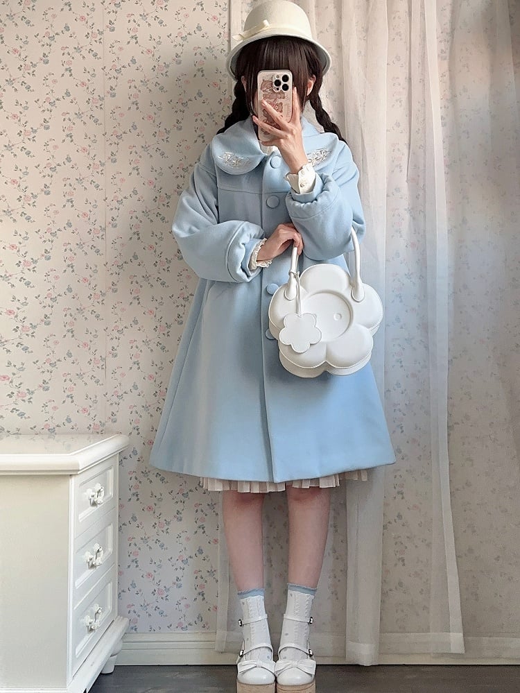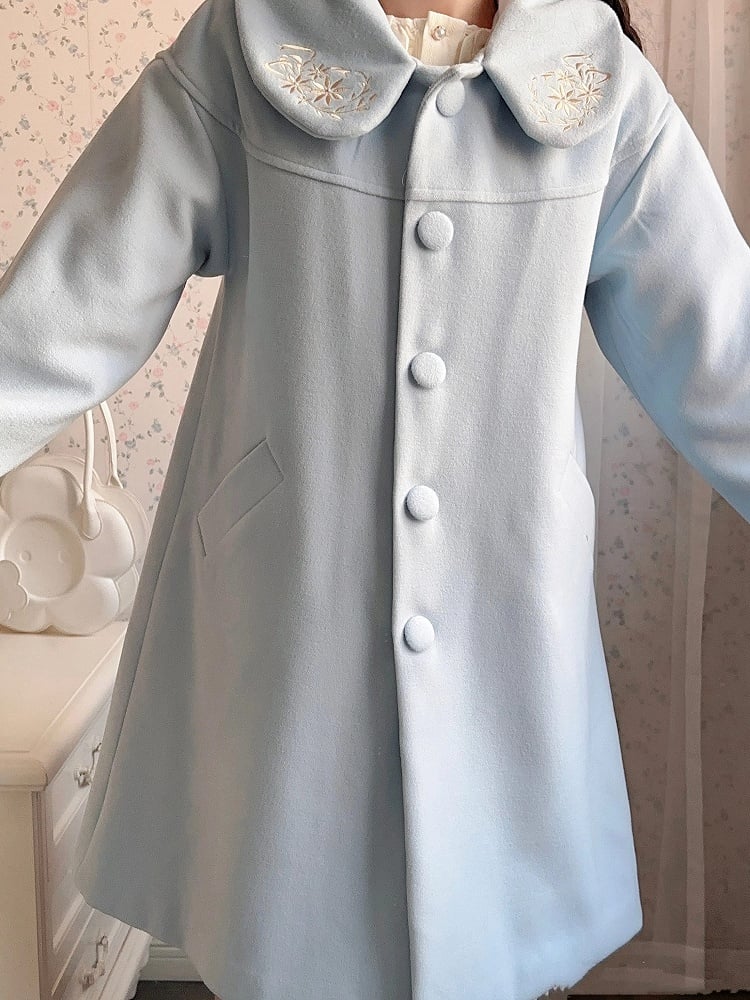 Blue Delicate Floral Round Flat Collar Woolen Coat