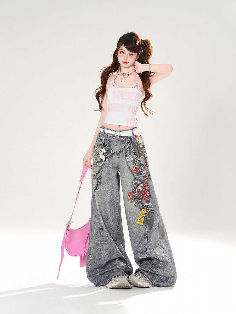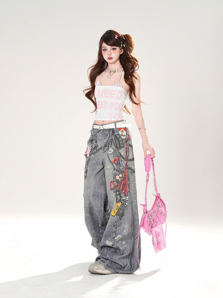 Blue Low Print Wide-leg Jeans Waist Spray Paint Chains