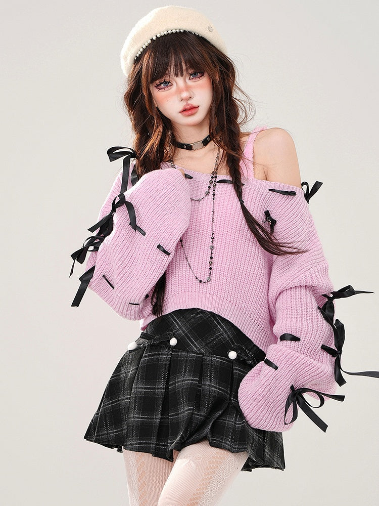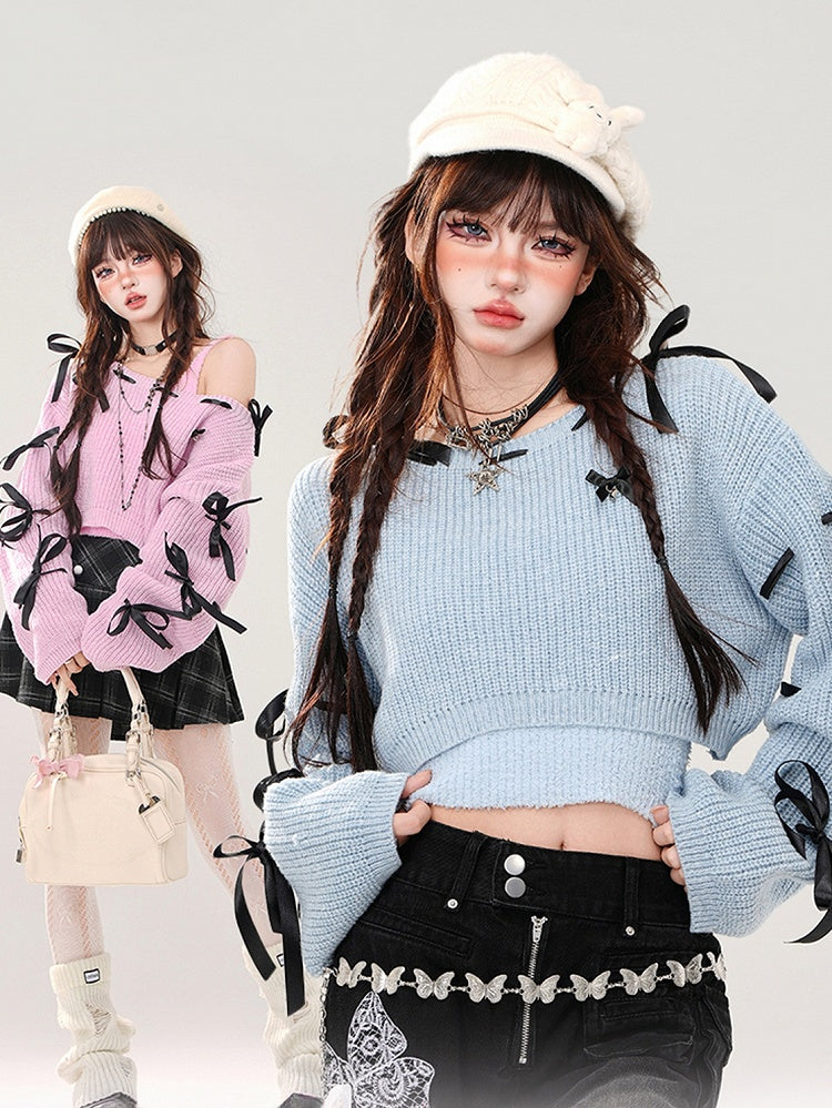 Blue/Pink Bows Adorned Sleeves Cropped Sweater with Cami Top Set