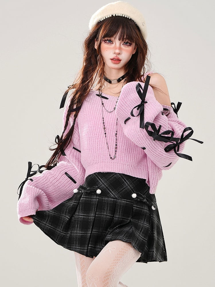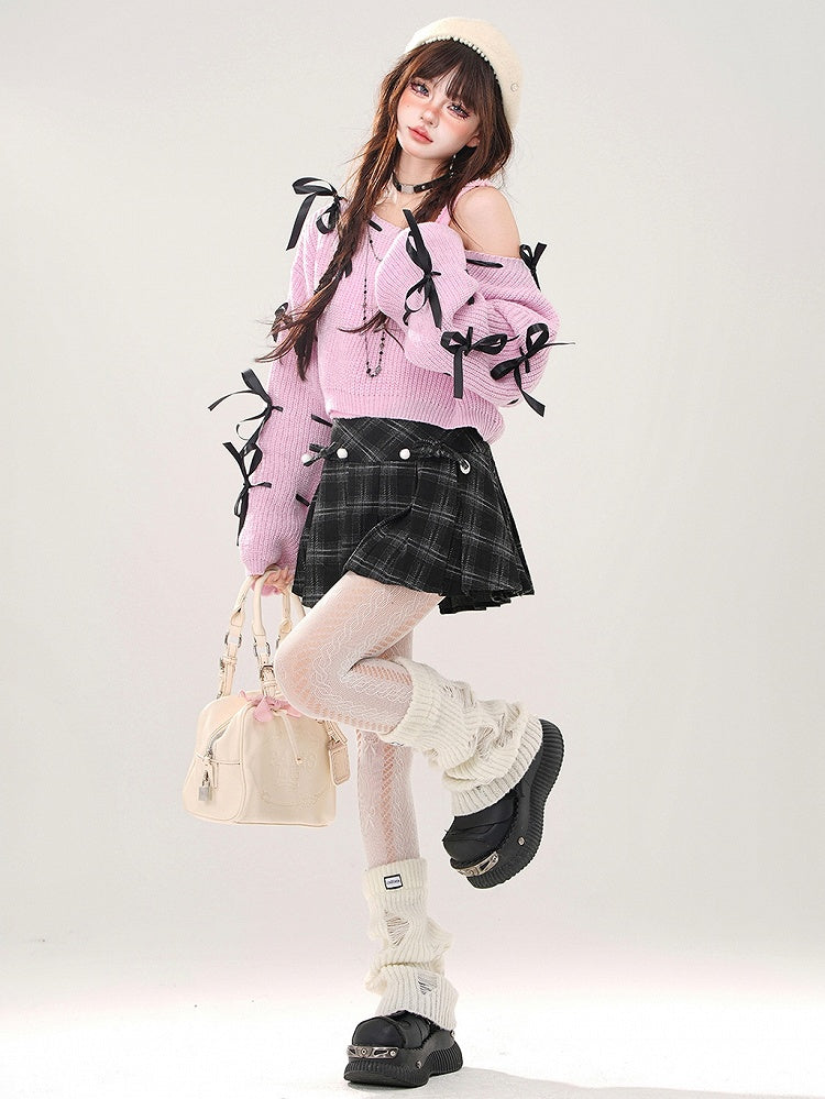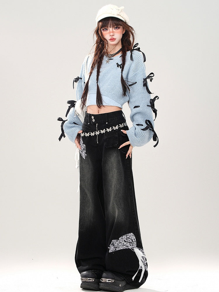 This adorable sweater and cami top set features blue and pink bows adorned on the sleeves, adding a touch of cuteness to your outfit. Stay stylish and comfortable with this cropped sweater and cami top combo.