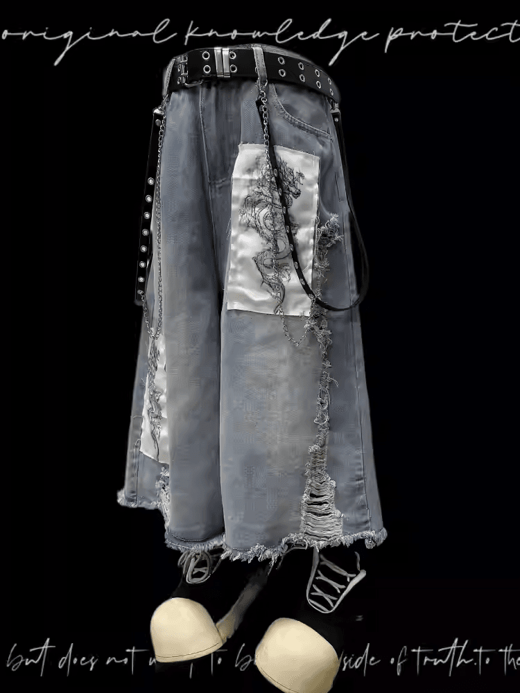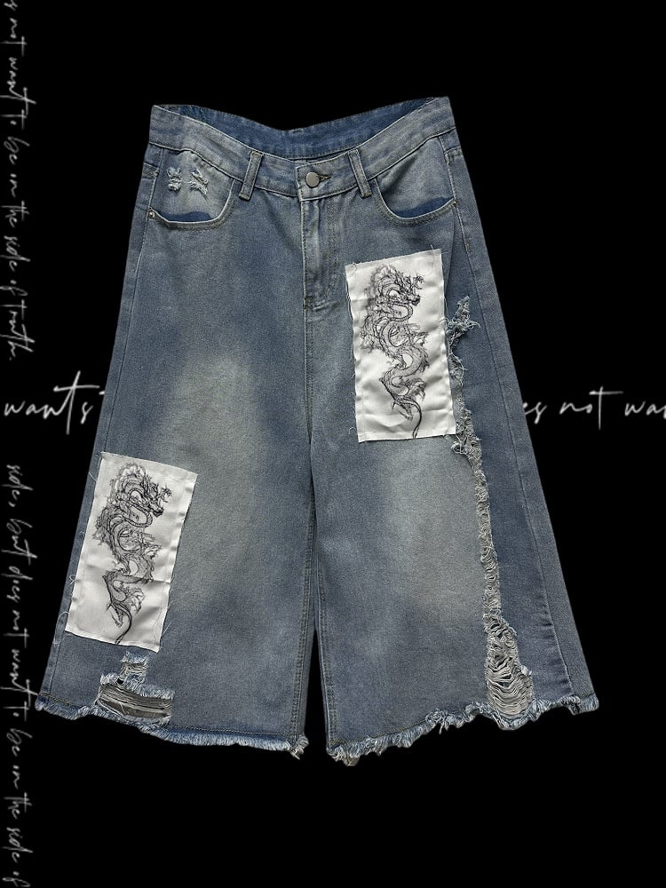 Blue Wide-leg Jeans Dragon Applique Raw Hem Distressed Holes Light