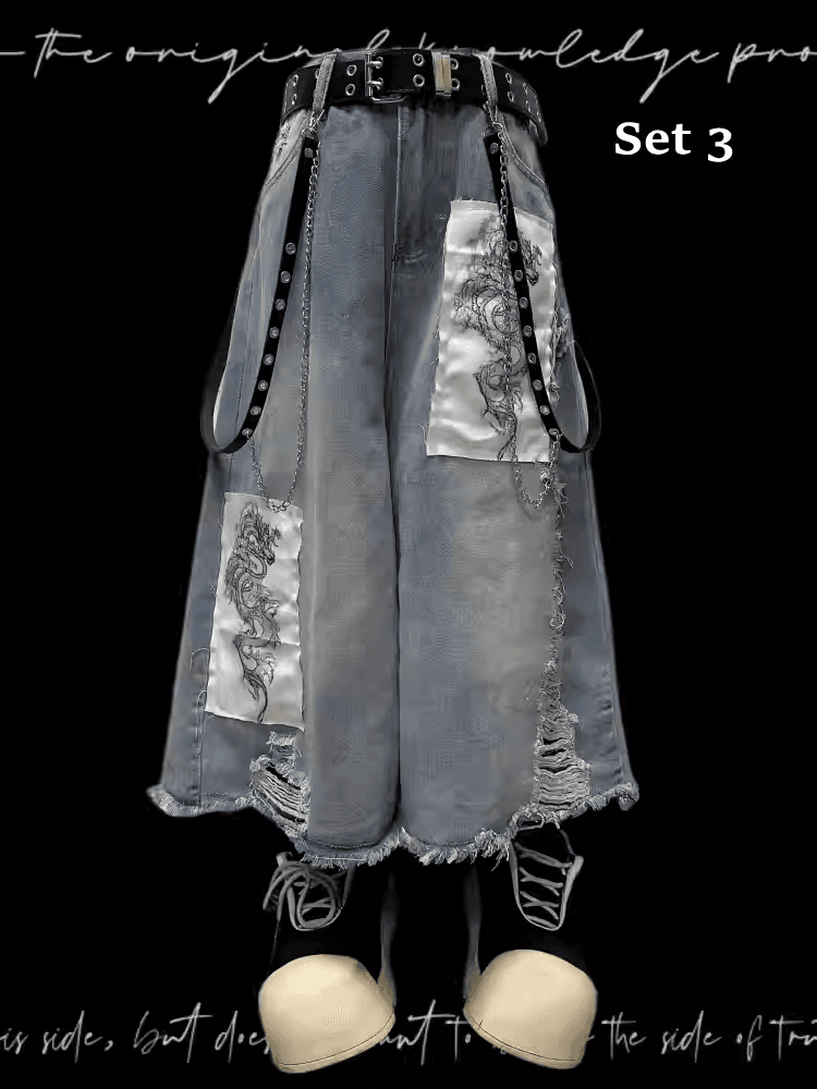 Dragon Applique Raw Hem Distressed Holes Light Blue Wide-leg Jeans