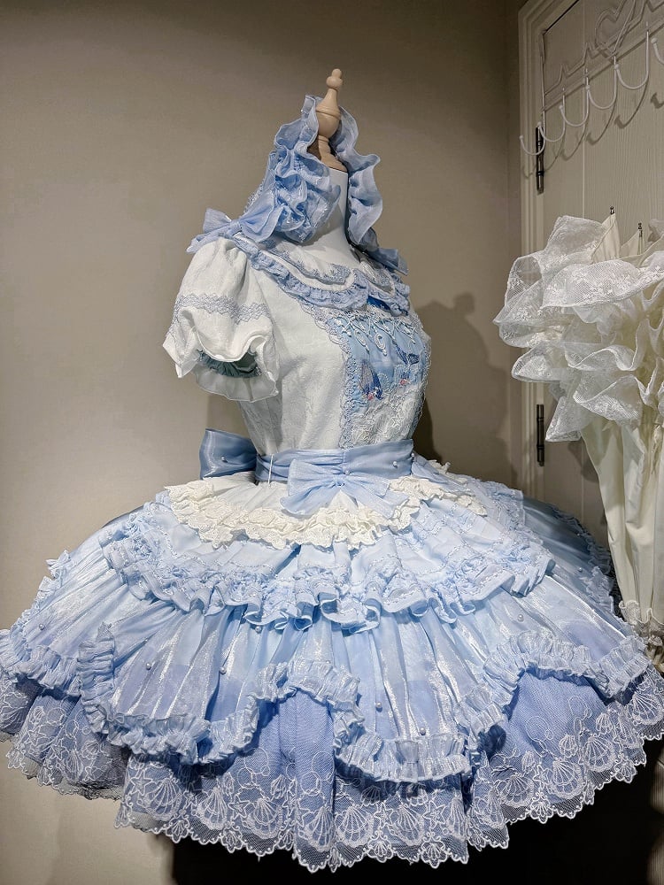 Blue and White Old School Lolita Fashion Dress Bowknot Detais JSK Set
