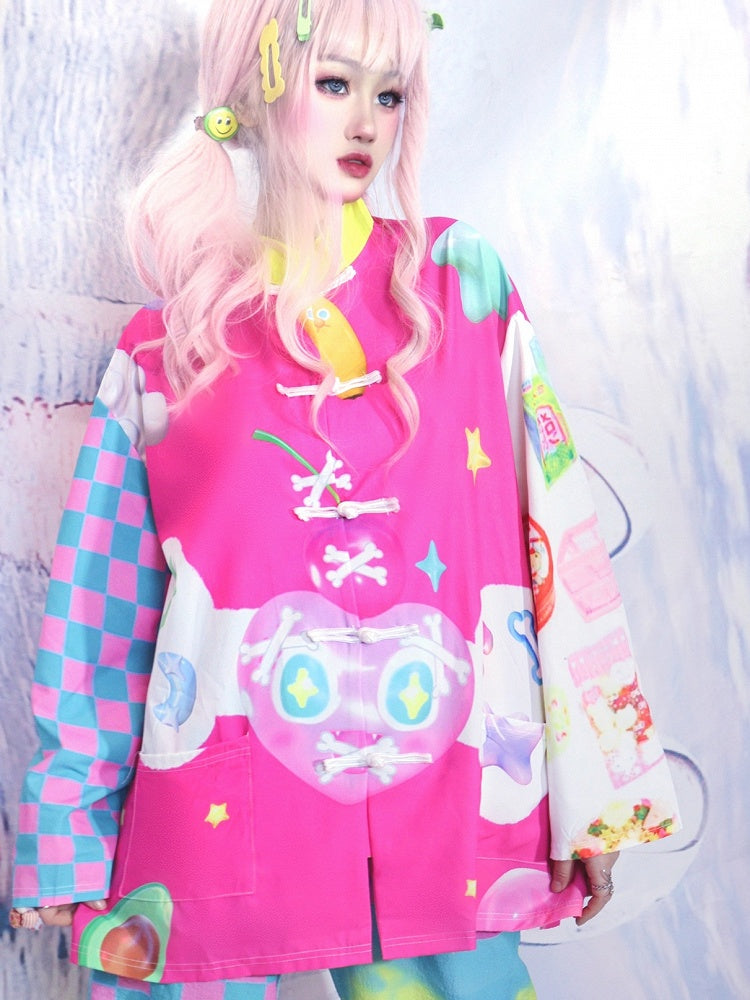 6 Colorful Y2K Heart Bone And Star Print Checked Pattern Shirt
