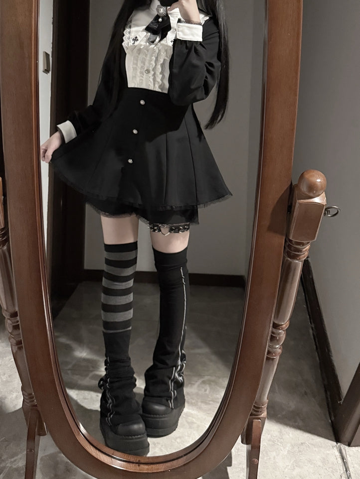 Jirai Kei Black Three-piece Set - Cross Embroidered Pointed Flat Collar Dress + Shorts + Bow Tie