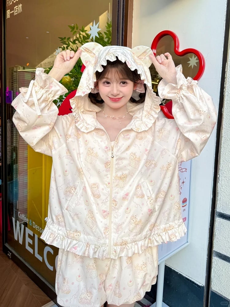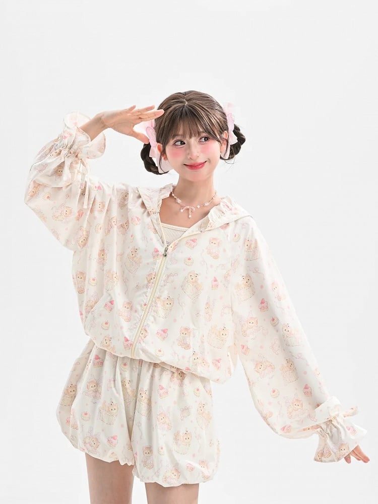 Bubble Shorts Waist Print Beige Elastic Allover Kitty